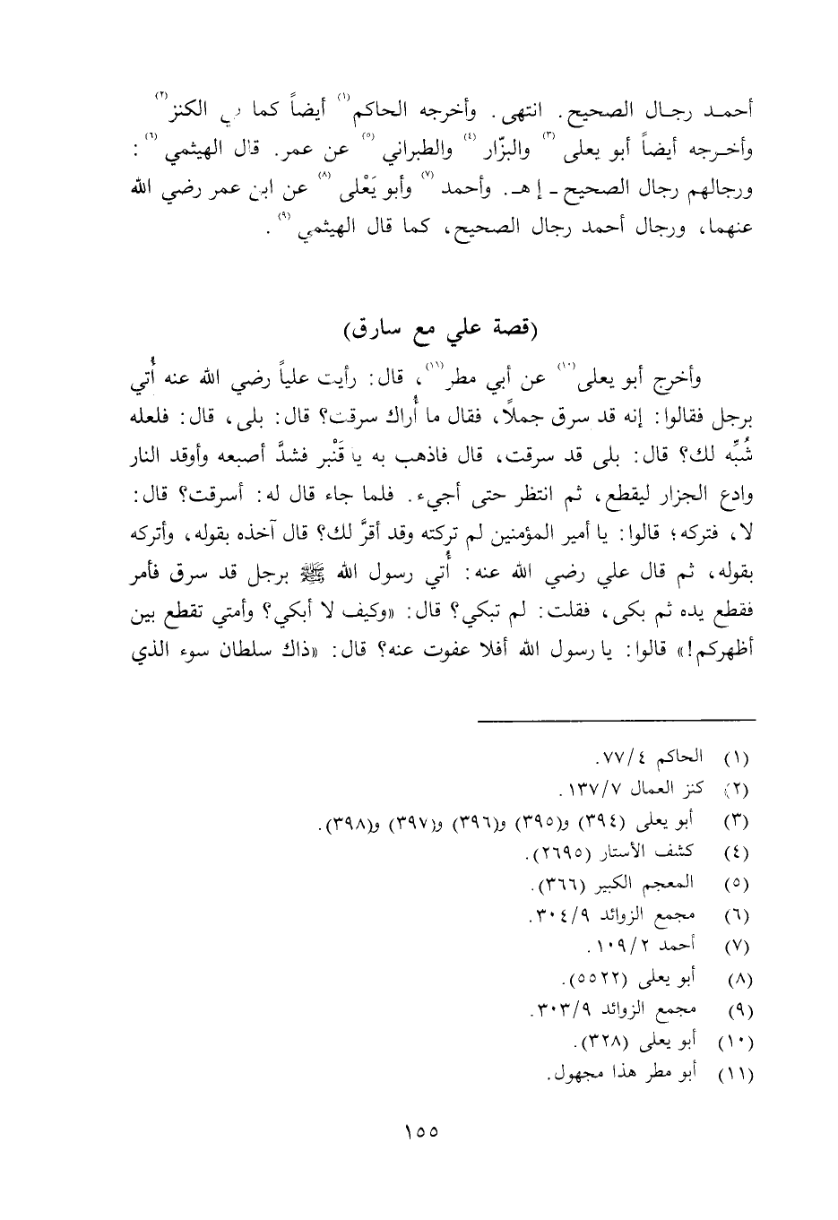 وأخرج أبو يعلى عن أبي مطر: قال: رأيت علياً رضي الله عنه أُتي برجل فقالوا: إنه قد سرق جملاً، فقال ما أراك سرقت؟ قال: بلى، قال: فلعله شُبِّه لك؟ قال: بلى قد سرقت، قال فاذهب به يا قَنْبر فشدَّ أصبعه وأوقد النار وادع الجزار ليقطع، ثم انتظر حتى أجيء. فلما جاء قال له: أسرقت؟ قال: لا، فتركه؛ قالوا: يا أمير المؤمنين لم تركته وقد أقرَّ لك؟ قال آخذه بقوله وأتركه بقوله، ثم قال علي رضي الله عنه: أُتي رسول الله صلى الله عليه وسلم برجل قد سرق فأمر فقطع يده ثم بكى، فقلت: لم تبكي؟ قال: «كيف لا أبكي؟ وأمتي تقطع بين أظهركم» قالوا: يا رسول الله أفلا عفوت عنه؟ قال: «ذاك سلطان سوء الذي