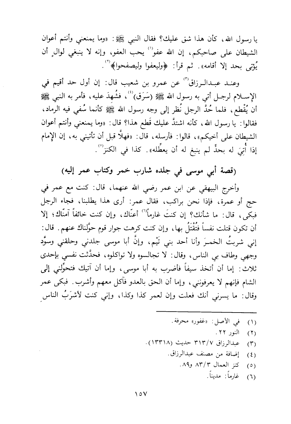 يا رسول الله كأنه اشتدَّ عليك قَطع هذا؟ قال: «وما يمنعني وأنتم أعوان الشيطان على أخيكم» ، قالوا: فأرسله، قال: فهلاَّ قبل أن تأتيني به، إن الإِمام إذا أتي له بحدَ لم ينبغ له أن يعطِّله» . كذا في الكنز (383 و89) .