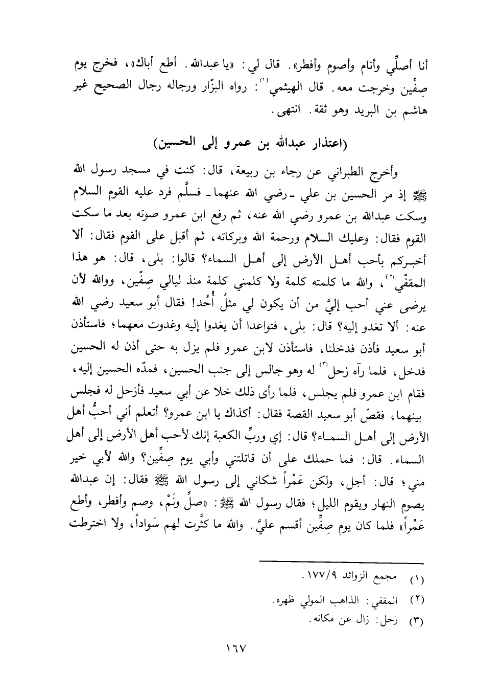 وأخرج الطبراني عن رجاء بن ربيعة قال: كنت في مسجد رسول الله صلى الله عليه وسلم إذ مر الحسين بن علي - رضي الله عنهما - فسلَّم فرد عليه القوم السلام وسكت عبد الله بن عمرو رضي الله عنه، ثم رفع ابن عمرو صوته بعد ما سكت القوم فقال: وعليك السلام ورحمة الله وبركاته، ثم أقبل على القوم فقال: ألا أخبركم بأحب أهل الأرض إلى أهل السماء؟ قالوا: بلى، قال: هو هذا المقفّي، والله ما كلمته كلمة ولا كلمني كلمة منذ ليالي صِفّين، ووالله لأن يرضى عني أحب إليَّ من أن يكون لي مثلُ أُحُد فقال له أبو سعيد رضي الله عنه: ألا تغدو إليه؟ قال: بلى، فتواعدا أن يغدوا إليه وغدوت معهما؛ فاستأذن أبو سعيد فأذن فدخلنا، فاستأذن لابن عمرو فلم يزل به حتى أذن له الحسين فدخل، فلما رآه زحل له وهو جالس إلى جنب الحسين، فمدّه الحسين إليه، فقام ابن عمرو فلم يجلس، فلما رأى ذلك خلا عن أبي سعيد فأزحل له فجلس بينهما، فقصّ أبو سعيد القصة فقال: أكذاك يا ابن عمرو؟ أتعلم أني أحبُّ أهل الأرض إلى أهل السماء؟ قال: إي وربِّ الكعبة إنك لأحب أهل الأرض إلى أهل السماء. قال: فما حملك على أن قاتلتني وأبي يوم صِفِّين؟ والله لأبي خير مني؛ قال: أجل، ولكن عَمْراً شكاني إلى رسول الله صلى الله عليه وسلم فاقل: إن عبد الله يصوم النهار ويقوم الليل؛ فقال رسول الله صلى الله عليه وسلم «صلِّ ونَمْ، وصم وأفطر، وأطع عَمْراً» فلما كان يوم صِفِّين أقسم عليَّ. والله ما كثَّرت لهم سَواداً، ولا اخترطت