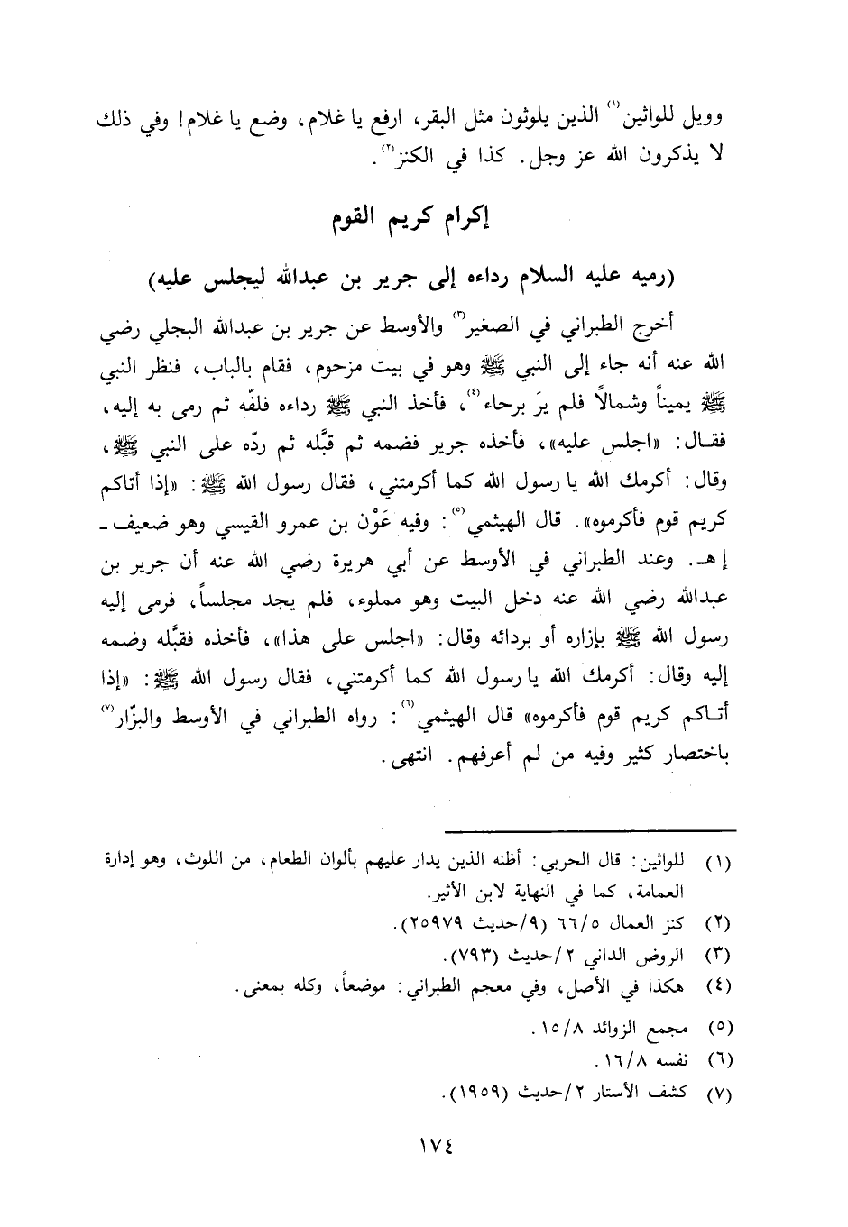 أخرج الطبراني في الصغير والأوسط عن جرير بن عبد الله البجلي رضي الله عنه أنه جاء إلى النبي صلى الله عليه وسلم وهو في بيت مزحوم، فقام بالباب، فنظر النبي صلى الله عليه وسلم يميناً وشمالاً فلم يرَ برحاء، فأخذ النبي صلى الله عليه وسلم رداءه فلفّه ثم رمى به إليه، فقال: «اجلس عليه» ، فأخذه جرير فضمه ثم قبَّله ثم ردّه على النبي صلى الله عليه وسلم وقال: أمرك الله يا رسول الله كما أكرمتني، فقال رسول الله صلى الله عليه وسلم «إذا أتاكم كريم قوم فأكرموه» قال الهيثمي: وفيه عَوْن بن عمرو القيسي وهو ضعيف - اهـ. وعند الطبراني في الأوسط عن أبي هريرة رضي الله عنه أن جرير بن عبد الله رضي الله عنه دخل البيت وهو مملوء، فلم يجد مجلساً، فرمى إليه رسول الله صلى الله عليه وسلم بإزاره أو برادئه وقال: «اجلس عى هذا» فأخذه فقبَّله وضمه إليه وقال: أكرمك الله يا رسول الله كما أكرمتني، فقال رسول الله صلى الله عليه وسلم «إذا أتاكم كريم قوم فأكرموه» قال الهيثمي: رواه الطبراني في الأوسط والبزّار باختصا كثير وفيه من لم أعرفهم. انتهى.