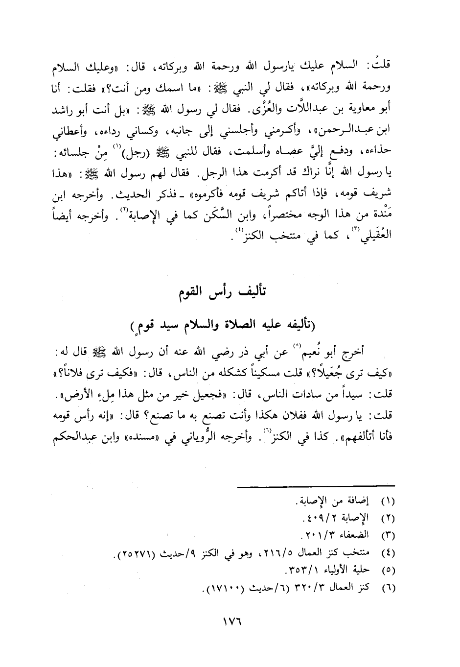 قلتُ: السلام عليك يا رسول الله ورحمة الله وبركاته، قال: «وعليك السلام ورحمة الله وبركاته» ، فقال لي النبي صلى الله عليه وسلم «ما اسمك ومن أنت؟» فقلت: أنا أبو معاوية بن عبد اللاَّلات والعُزَّى. فقال لي رسول الله صلى الله عليه وسلم «بل أنت أبو راشد بن عبد الرحمن» ، وأكرمني وأجلسني إلى جانبة، وكساني رداءه، وأعطاني حداه، ودفع إليَّ عصاه وأسلمت، فقال للنبي صلى الله عليه وسلم مِنح جلسائه: يا رسول الله إنَّا نراك قد أكرمت هذا الرجل، فقال لهم رسول الله صلى الله عليه وسلم «هذا شريف قومه، فإذا أتاكم شريف قومه فأكرموه» - فذكر الحديث. وأخرجه ابن مَنْده من هذا الوجه مختصراً، وابن السَّكَن كما في الإِصابة. وأخرجه أيضاً العُقَيلي، كما في منتخب الكنزه.