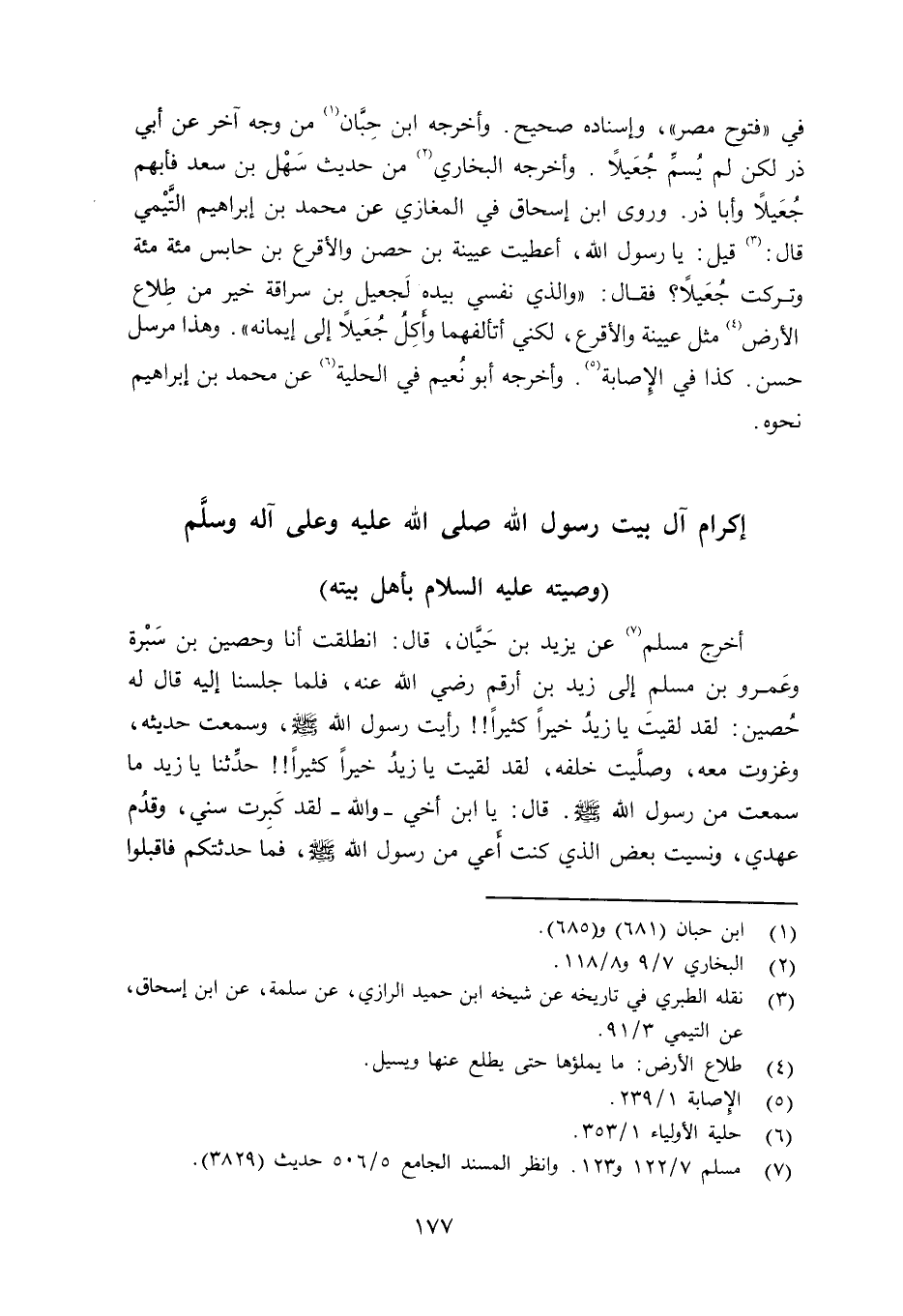في فتوح مصر، وإسناده صحيح. وأخرجه ابن حِبَّان من وجه آخر عن أبي ذر لكن لم يُسمَّ جُعَيلاً. وأخرجه البخاري من حديث سَهْل بن سعد فأبهم جُعَيلاً وأبا ذر. وروى ابن إسحاق في المغازي عن محمد بن إبراهيم التَّيْمي قال: قيل: يا رسول الله، أعطيت عيينة بن حصن والأقرع بن حابس مائة مائة وتركت جُعَيلاً؟ فقال: والذي نفسي بيده لَجعيل بن سراقة خير من طِلاع الأرض مثل عيينة والأقرع، لكني أتألفهما وأَكِلُ جُعَيلاً إلى إيمانه» . وهذا مرسل حسن. كذا في الإِصابة. وأخرجه أبو نُعيم في الحلية عن محمد بن إبراهيم نحوه.