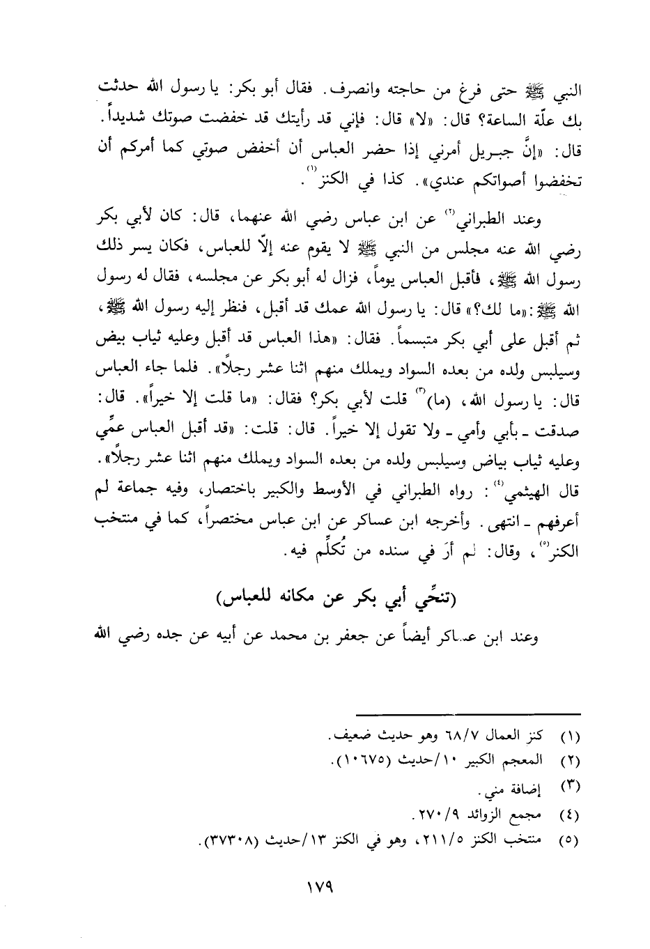 النبي صلى الله عليه وسلم حتى فرغ من حاجته وانصرف. فقال أبو بكر: يا رسول الله حدثت بك علّة الساعة؟ قال: «لا» قال: فإني قد رأيتك قد خفضت صوتك شديداً. قال: «إنَّ جبريل أمرني إذا حضر العباس أن أخفض صوتي كما أمرهم أن تخفضوا أصواتكم عندي» . كذا في الكنز.