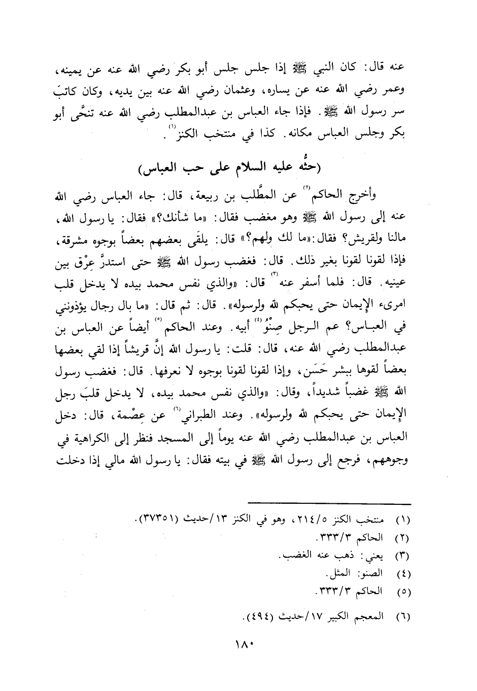 وأخرج الحاكم عن المطَّلب بن ربيعة قال: جاء العباس رضي الله عنه إلى رسول الله صلى الله عليه وسلم وهو مغضب فقال: «ما شأنك؟ فقال: يا رسول الله، ما لنا ولقريش؟ فقال: «مالك ولهم؟» قال: يلقَى بعضهم بعضاً بوجوه مشرقة، فإذا لقونا لقونا بغير ذلك. قال: فغضب رسول الله صلى الله عليه وسلم حتى استدرَّ عِرْق بين عينيه. قال: فلما أسفر عنه قال: «والذي نفس محمد بيده لا يدخل قلب امرىء الإِيمان حتى يحبكم لله ولرسوله» . قال: ثم قال: «ما بال رجال يؤذونني في العباس؟ عم الرجل صِنْوُ أبيه. وعند الحاكم أيضاً عن العباس بن عبد المطلب رضي الله عنه قال: قلت: يا رسول الله إنَّ قريشاً إذا لقي بعضها بعضاً لقوها ببشر حَسَن، وإذا لقونا لقونا بوجوه لا نعرفها. قال: فغضب رسول الله صلى الله عليه وسلم غضباً شديداً، وقال: «والذي نفس محمد بيده، لا يدخل قلب رجل الإِيمان حتى يحبكم لله ولرسوله» . وعند الطبراني عن عِصْمة قال: دخل العباس بن عبد المطلب رضي الله عنه يوماً إلى المسجد فنظر إلى الكراهية في وجوههم، فرجع إلى رسول الله صلى الله عليه وسلم في بيته فقال: يا رسول الله مالي إذا دخلت