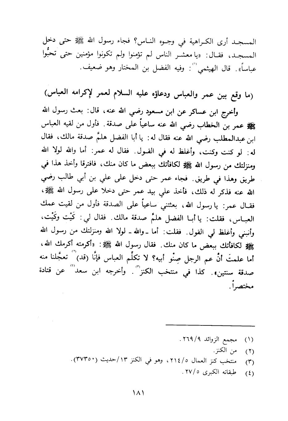 وأخرج ابن عساكر عن ابن مسعود رضي الله عنه قال: بعض رسول الله صلى الله عليه وسلم عمر بن الخطاب رضي الله عنه ساعياً على صدقة. فأول من لقيه العباس بن عبد الملب رضي الله عنه فقال: يا أبا الفضل هلمَّ صدقة مالك، فقال له: لو كنت وكنت، وأغلظ له في القول. فقال له عمر: أما والله لولا الله ومنزلتك من رسول الله صلى الله عليه وسلم لكافأتك ببعض ما كان منك، فافترقا وأخذ هذا في طريق وهذا في طريق. فجاء عمر حتى دخل على علي بن أبي طالب رضي الله عنه فذكر له ذلك، فأخذ علي بيد عمر حتى دخلا على رسول الله صلى الله عليه وسلم فقال عمر: يا رسول الله، بعثتني ساعياً على الصدقة فأول من لقيت عمك العباس، فقلت: يا أبا الفضل هلمَّ صدقة مالك. فقال لي: كَيْت وكَيْت، وأنبني وأغلظ لي القول. فقلت: أما - والله - لولا الله ومنزلتك من رسول الله صلى الله عليه وسلم لكافأتك ببعض ما كان منك. فاقل رسول الله صلى الله عليه وسلم «أكرمته أكرمك الله، أما علمتَ أنَّ عم الرجل صِنْوا أبيه؟ لا تكلِّم العباس فإنَّا تعجَّلنا منه صدقة سنتين» . كذا في منتخب الكنز. وأخرجه ابن سعد عن قتادة مختصراً.
