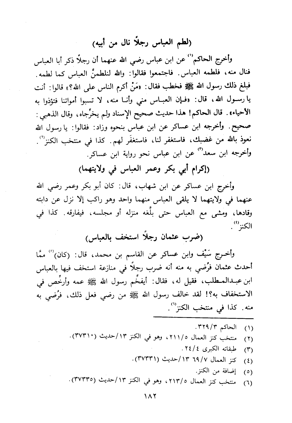 وأخرج سَيْف وابن عساكر عن القاسم بن محمد قال: ممَّا أحدث عثمان فرُضي به منه أنه ضرب رجلاً في منازعة استخف فيها بالعباس بن عبد المطلب، فقيل له، فقال: أيفخِّم رسول الله صلى الله عليه وسلم عمه وأرخِّص في الاستخفاف به؟ لقد خالف رسول الله صلى الله عليه وسلم من رضي فعل ذلك، فرُضي به منه. كذا في منتخب الكنز.