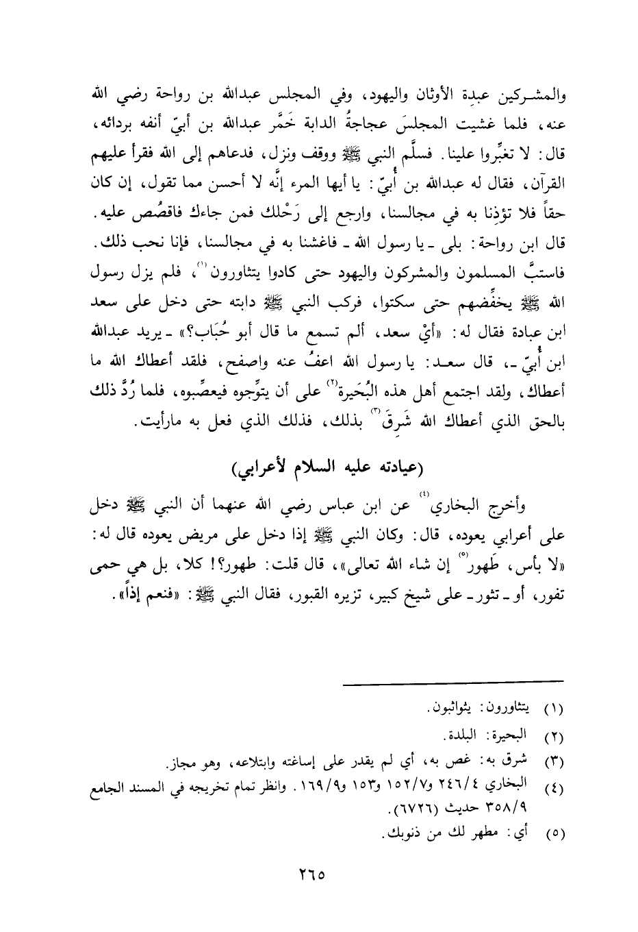 والمشركين عبدةِ الأوثان واليهود، وفي المجلس عبد الله بن رواحة رضي الله عنه، فلما غشيت المجلسَ عجاجةُ الدابة خَمَّر عبد الله بن أبي أنفه بردائه، قال: لا تغبِّروا علينا. فسلَّم النبي صلى الله عليه وسلم ووقف ونزل، فدعاهم إلى الله فقرأ عليهم القرآن، فقال له عبد الله بن أبيّ: يا أيها المرء إنَّه لا أحسنَ مما تقول، إن كان حقاً فلا تؤذِنا به في مجالسنا، وارجع إلى رَحْلك فمن جاءك فاقصُص عليه. قال ابن رواحة: بلى - يا رسول الله - فاغشَنا به في مجالسنا، فإنا نحب ذلك. فاستبَّ المسلمون والمشركون واليهود حتى كادوا يتثاورون، فلم يزل رسول الله صلى الله عليه وسلم يخفَّضهم حتى سكتوا، فركب النبي صلى الله عليه وسلم دابته حتى دخل على سعد بن عبادة فقال له: «أيْ سعد، ألم تسمع ما قال أبو حُبَاب؟» - يريد عبد الله بن أبي، قال سعد: يا رسول الله اعفُ عنه واصفح، فلقد أعطاك الله ما أعطاك، ولقد اجتمع أهل هذه البُحَيرة على أن يتوِّجوه فيعصِّبوه، فلما رُدَّ ذلك بالحق الذي أعطاك الله شَرِقَ بذلك، فذلك الذي فعل به ما رأيت.