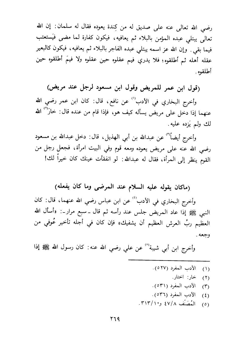 وأخرج البخاري في الأدب (ص87) عن نافع رضي الله عنه قال: كان ابن عمرو رضي الله عنهما إذا دخل على مريض يسأله كيف هو، فإذا قام من عنده قال: خارَ الله لك ولم يَزده عليه. وأخرج أيضاً (ص78) عن عبد الله بن أبي الهذيل قال: دخل عبد الله بن مسعود رضي الله عنه على مريض يعوده ومعه قوم وفي البيت امرأة، فجعل رجل من القوم ينظر إللى المرأة، فقال له عبد الله: لو انفقأتْ عينك كل خيراً لك.