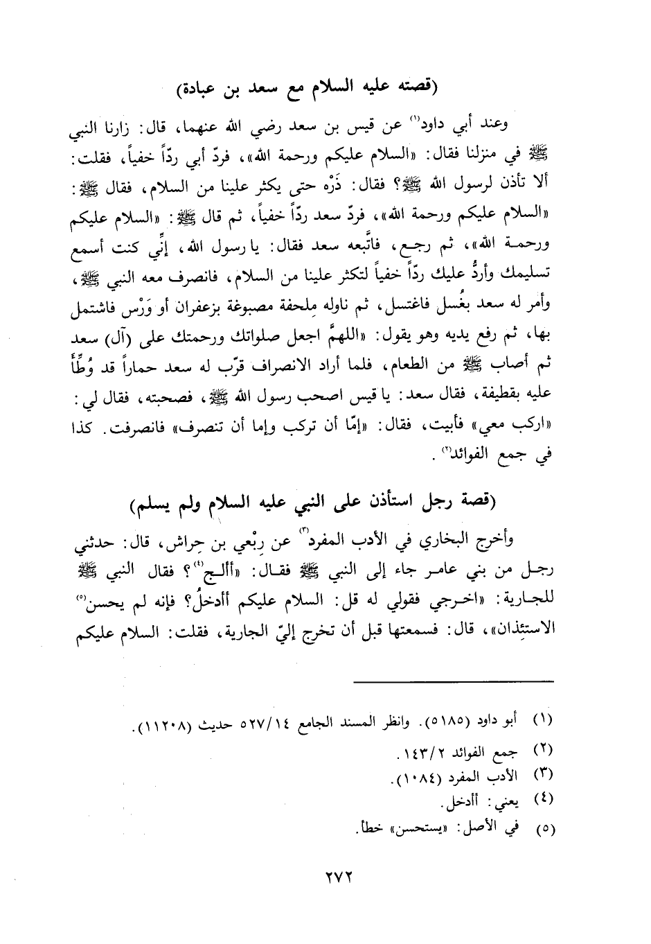 وعند أبي داود عن قيس بن سعد رضي الله عنهما قال: زارنا النبي صلى الله عليه وسلم في منزلنا فقال: «السلام عليكم ورحمة الله» ، فردّ أبي ردّاً خفياً، فقلت: ألا تأذن لرسول الله صلى الله عليه وسلم فقال: ذَرْه حتى يكثر علينا من السلام، فقال صلى الله عليه وسلم «السلام عليكم ورحمة الله» ، فردّ سعد ردّاً خفياً، ثم قال صلى الله عليه وسلم «السلام عليكم ورحمة الله» ، ثم رجع. فاتَّبعه سعد فقال: يا رسول الله، إنِّي كنت أسمع تسليمك وأردُّ عليك ردّاً خفياً لتكثر علينا من السلام، فانصرف معه النبي صلى الله عليه وسلم وأمر له سعد بغُسل فاغتسل، ثم ناوله مِلحفة مصبوغة بزعفران أو وَرْس فاشتمل بها، ثم رفع يده وهو يقول: «اللهمَّ اجعل صلواتك ورحمتك على (آل) سعد» ثم أصاب صلى الله عليه وسلم من الطعام، فلما أراد الانصراف قرب له سعد حماراً قد وُطِّأَ عليه بقطيفة، فقال سعد: يا قيس اصحب رسول الله صلى الله عليه وسلم فصحبته، فقال لي: «اركب معي» فأبيت، فقال: «إِمَّا أن تركب وإما أن تنصرف» فانصرفت. كذا في جمع الفوائد.