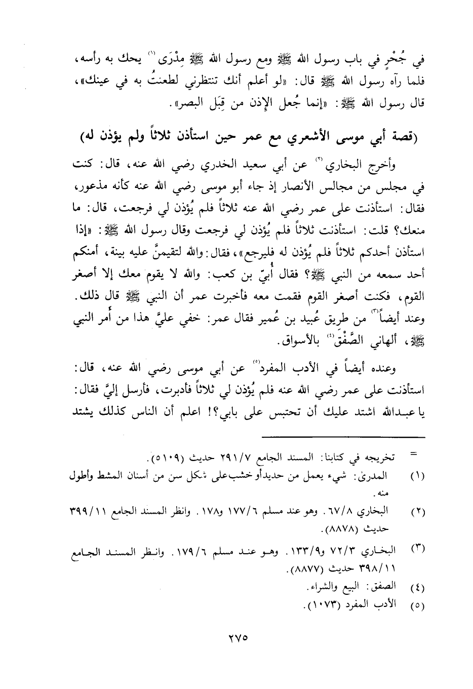 وعنده أيضاً في الأدب المفرد (ص157) عن أبي موسى رضي الله عنه قال: استأذنت على عمر رضي الله عنه فلم يُؤذن لي ثلاثاً فأدبرت، فأرسل إليَّ فقال: يا عبد الله اشتد عليك أن تحتبس على بابي؟ اعلم أن الناس كذلك يشتد