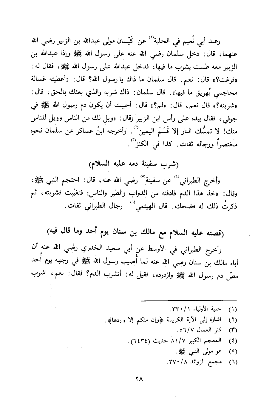 وعند أبي نُعيم في الحلية عن كَيْسان مولى عبد الله بن الزبير رضي الله عنهما قال: دخل سلمان رضي الله عنه على رسول الله صلى الله عليه وسلم وإذا عبد الله بن الزبير معه طست يشرب ما فيها، فدخل عبد الله على رسول الله صلى الله عليه وسلم فقال له: «فرغت؟» قال: نعم. قال سلمان ما ذاك يا رسول الله؟ قال: «أعطيته غسالة محاجمي يُهريق ما فيها» . قال سلمان: ذاك شربه والذي بعثك بالحق، قال: «شربته؟» قال نعم، قال: «لم؟» قال: أحببت أن يكون دم رسول الله صلى الله عليه وسلم في جوفي، فقال بيده على رأس ابن الزبير وقال: «ويل لك من الناس وويل للناس منك لا تمسُّك النار إلا قَسَم اليمين. «وأخرجه ابن عساكر عن سلمان نحوه مختصراً ورجاله ثقات. كذا في الكنز.