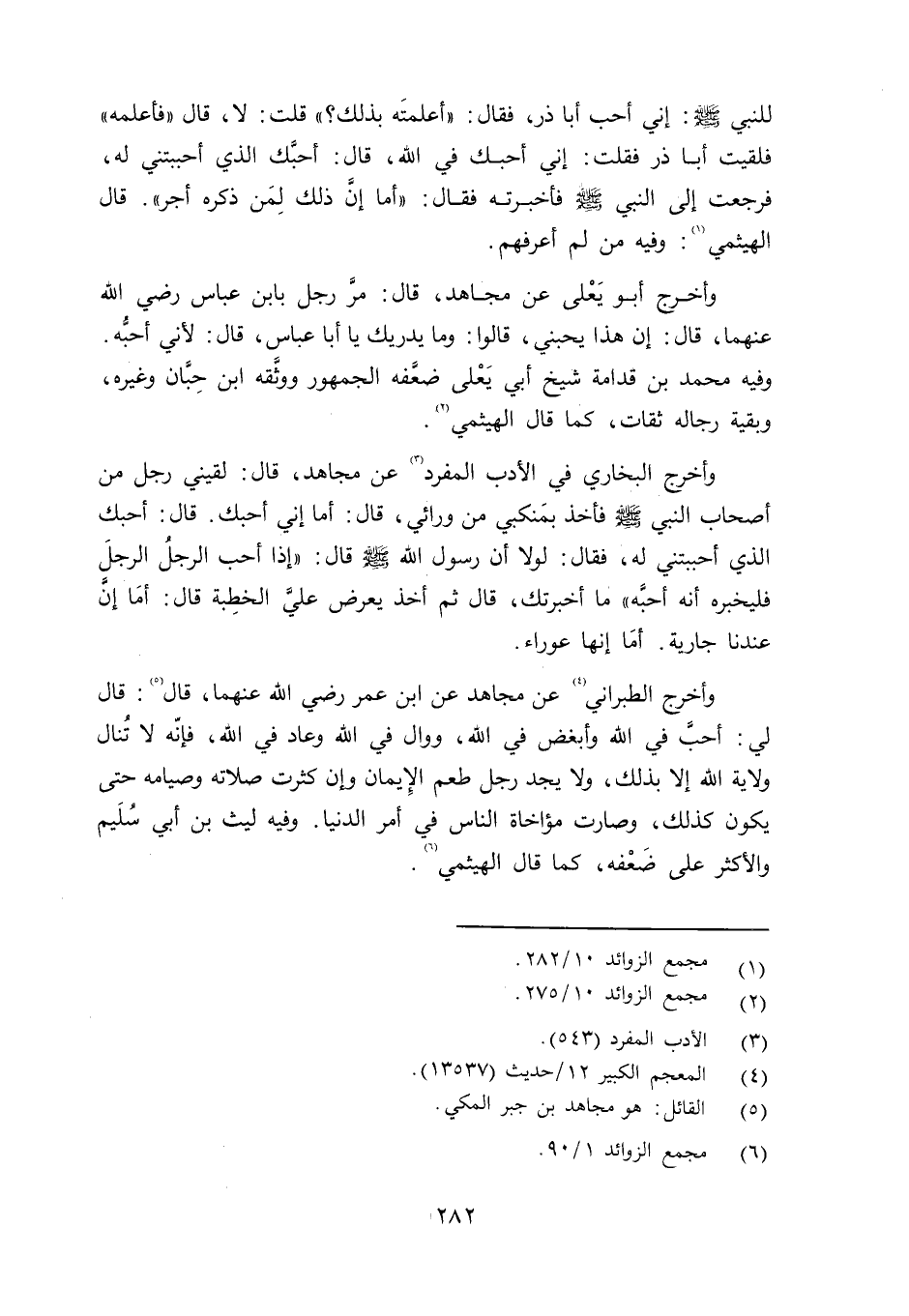 وأخرج البخاري في الأدب المفرد (ص80) عن مجاهد قال: لقيني رجل من أصحاب النبي صلى الله عليه وسلم فأخذ بمَنكبي من ورائي قال: أما إني أحبك قال: أحبك اذي أحببتني له، فقال: لولا أن رسول الله صلى الله عليه وسلم قال: «إذا أحب الرجلُ الرجلَ فليخبره أنَّه أحبَّه» ما أخبرتك، قال: ثم أخذ يعرض عليَّ الخِطبة قال: أما إنَّ عندنا جارية. أمَا إنها عوراء. وأخرج الطبراني عن مجاهد عن ابن عمر رضي الله عنهما قال قال لي: أحبَّ في الله وأبغض في الله، ووال في الله وعاد في الله، فإنّه لا تُنال ولا ية الله إلا بذلك، ولا يجد رجل طعم الإيمان وإن كثرت صلاته وصيامه حتى يكون كذلك، وصارت مؤاخاة الناس في أمر الدنيا. وفيه ليث بن أبي سُلَيم والأكثر على ضَعْفه، كما قال الهيثمي.