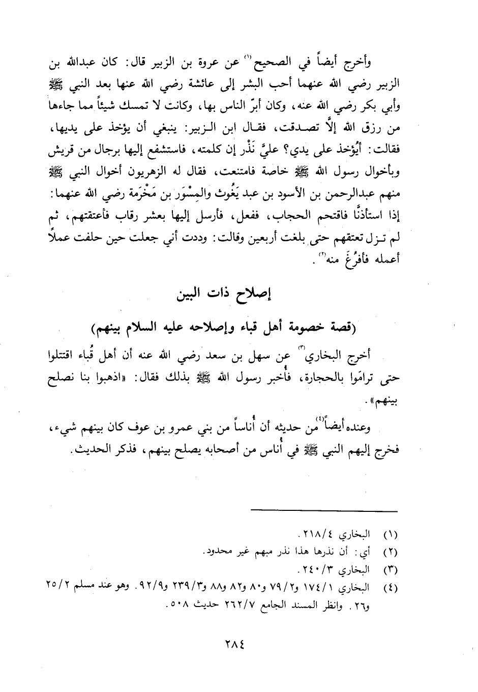أخرج البخاري عن سهل بن سعد رضي الله عنه أن أهل قُباء اقتتلوا حتى ترامَوا بالحجارة، فأُخبر رسول الله صلى الله عليه وسلم بذلك فقال: «اذهبوا بنا نصلح بينهم» وعنده أيضاً (ص370) من حديثه أن أُناساً نم بني عمرو ابن عوف كان بينهم شيء، فخرج إليهم صلى الله عليه وسلم في أُناس من أصحابه يصلح بينهم فذكر الحديث.