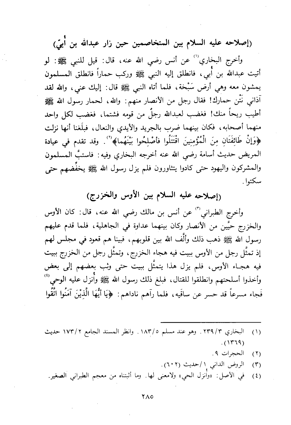 وأخرج البخاري عن أنس رضي الله عنه قال: قيل للنبي صلى الله عليه وسلم أتيت عبد الله بن أُبيّ، فانطلق إليه النبي صلى الله عليه وسلم وركب حماراً فانطلق المسلمون يمشون مع وهي أرض سَبْخة، فلما أتاه النبي صلى الله عليه وسلم قال: إليك عني، والله لقد آذاني نَتْن حمارك فقال رجل من الأنصار منهم: والله، لحمار رسول الله صلى الله عليه وسلم أطيب ريحاً منك فغضب لعبد الله رجلٌ من قومه فشتما، فغضب لكل واحد منهما أصحابه، فكان بينهما ضرب بالجريد والأيدي والنعال، فبلَغنا أنها نزلت {وَإِن طَآئِفَتَانِ مِنَ الْمُؤْمِنِينَ اقْتَتَلُواْ فَأَصْلِحُواْ بَيْنَهُمَا} (سورة الحجرات، الآية: 9) . وقد تقدّم في عيادة المريض حديث أسامة رضي الله عنه أخرجه البخاري وفيه: فاستبَّ المسلمون والمشركون واليهود حتى كادوا يتثاورون فلم يزل رسول الله صلى الله عليه وسلم يخفِّضهم حتى سكتوا.