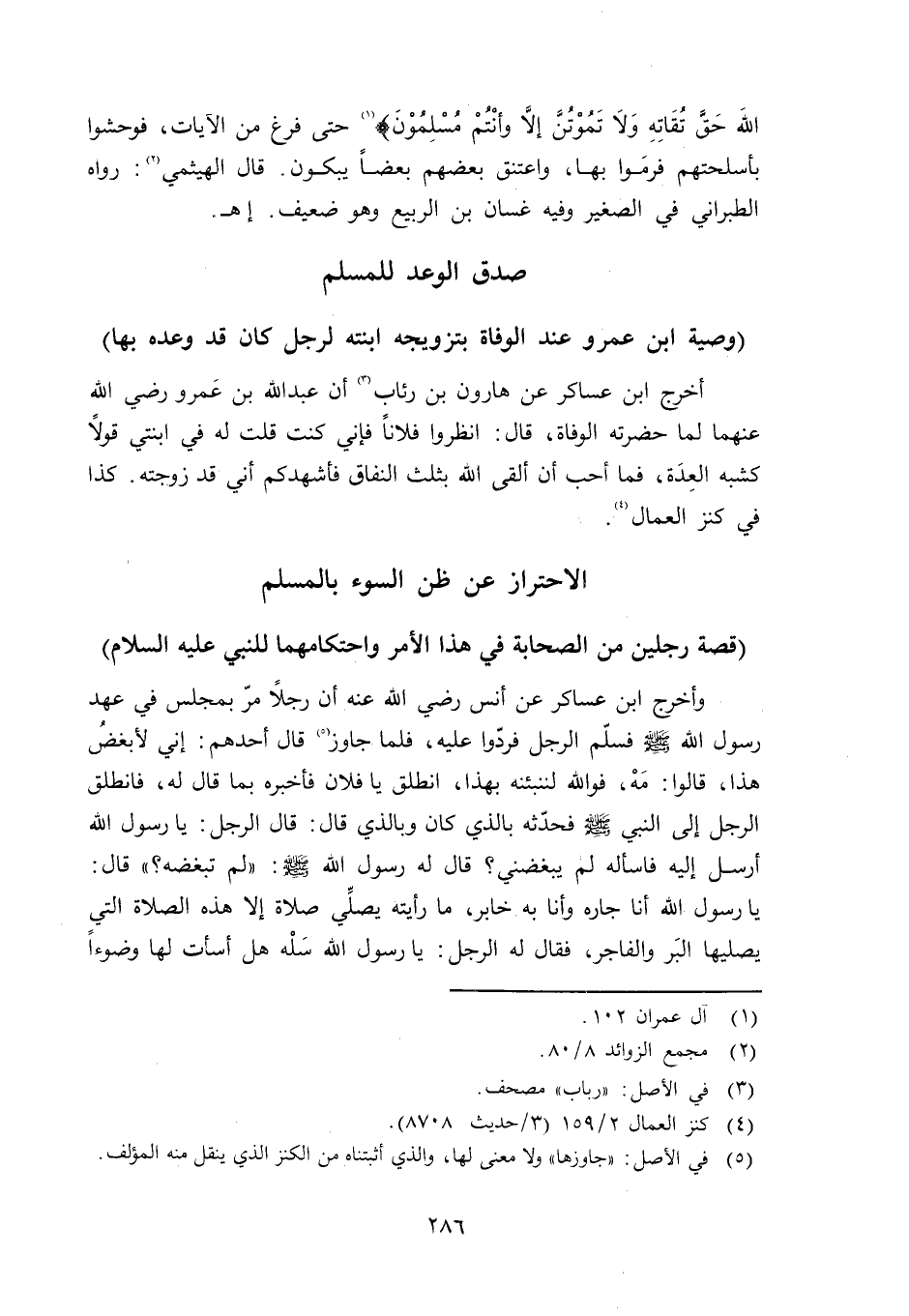 أخرج ابن عساكر عن هارون بن رباب أن عبد الله بن عمرو رضي الله عنهما لما حضرته الوفاة: قال: انظروا فلاناً فإني كنت قلت له في ابنتي قولاً كشبه العِدَة، فما أحب أن ألقى الله بثلث النفاق فأشهدكم أني قد زوجته. كذا في كنز العمال.