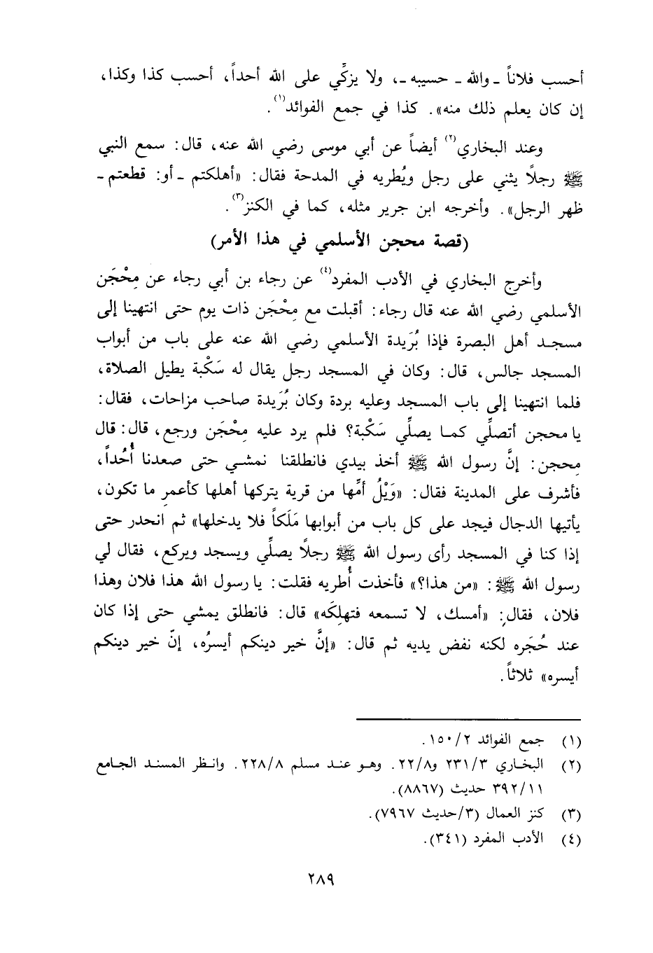وأخرج البخاري في الأدب المفرد (ص51) عن رجاء بن أبي رجاء عن مِحْجَن الأسلمي رضي الله عنه قال رجاء: أقبلت مع مِحْجَن ذات يوم حتى انتهينا إلى مسجد أهل البصرة فإذا بُرَيدة الأسلمي رضي الله عنه على باب من أبواب المسجد جالس، قال: وكان في المسجد رجل يقال له سَكْبَة يطيل الصلاة، فلما انتهينا إلى باب المسجد وعليه بردة وكان بُرَيدة صاحب مزاحات، فقال: يا محجن أتصلِّي كما يصلِّي سَكْبة؟ فلم يرد عليه مِحْجَن ورجع، قال قال مِحْجَن: إنَّ رسول الله صلى الله عليه وسلم أخذ بيدي فانطلقنا نمشي حتى صعدنا أُحُداً، فأشرف على المدينة فقال: «وَيْل امِّها من قرية يتركها أهلها كأعمرِ ما تكون، يأتيها الدجال فيجد على كل باب من أبوابها مَلَكاً فلا يدخلها» ثم انحدر حتى إذا كنا في المسجد رأى رسول الله صلى الله عليه وسلم رجلاً يصلِّي ويسجد ويركع، فقال لي رسول الله صلى الله عليه وسلم «من هاذ؟» فأخذت أُطريه فقلت: يا رسول الله هذا فلان وهذا فلان، فقال: «أمسك، لا تسمعه فتهلِكَه» قال: فانطلق يمشي حتى إذا كان عند حُجعره لكنه نفض يدهي ثم قال: «إنَّ خير دينكم أيسرُه، إنّ خير دينكم أيسره» ثلاثاً.