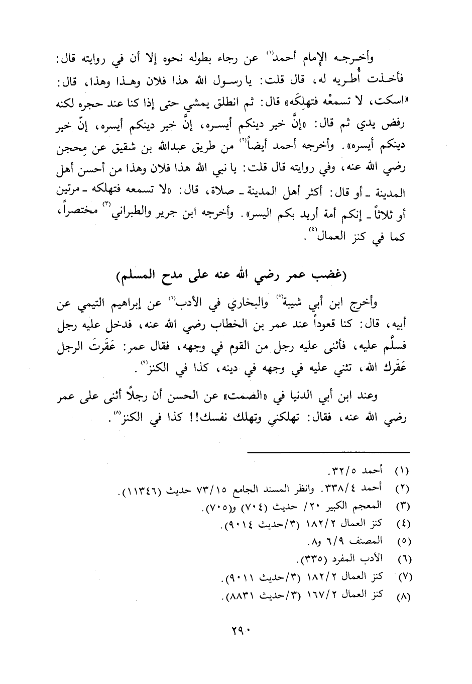 وأخرجه الإمام أحمد عن رجاء بطوله نحوه إلا أن في روايته قال: فأخذت أُطريه له، قال قلت: يا رسول الله هذا فلان وهذا وهذا، قال: اسكت، لا تسمعْه فتهلِكَه» قال: ثم انطلق يمشي حتى إذا كنا عند حجره لكنه رفض يدي ثم قال: «إنَّ خير دينكم أيسره، إنَّ خير دينكم أيسره، إنَّ خير دينكم أيسره» . وأخرجه أحمد أيضاً من طريق عبد الله بن شقيق عن محِجن رضي الله عنه وفي روايته قال قلت: يا نبي الله هذا فلان وهذا من أحسن أهل المدينة - أو قال: أكثر أهل المدينة - صلاة، قال: «لا تسمعه فتهلكه - مرتين أو ثلاثاً - إنكم أمة أريد بكم اليسر» . وأخرجه ابن جرير والطبراني مختصراً، كما في كنزل العمال.