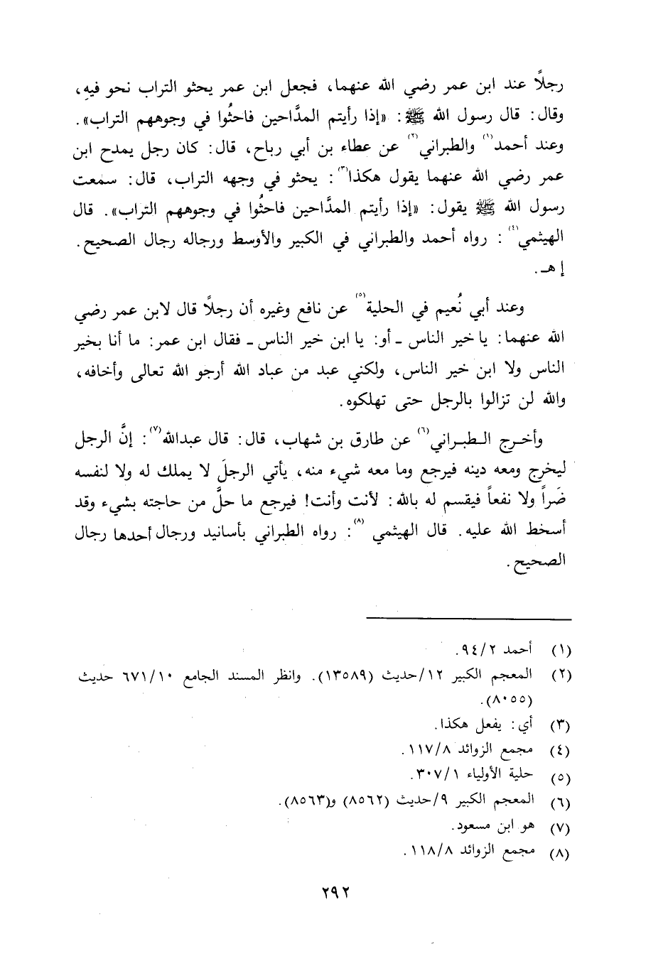 رجلاً عند ابن عمر رضي الله عنهما، فجعل ابن عمر يحثو التراب نحو فيهِ وقال: قال رسول الله صلى الله عليه وسلم «إذا رأيتم المدَّحين فاحثُوا في وجوههم التراب» . وعند أحمد والطبراني عن عطاء بن أبي رباح قال: كان رجل يمدح ابن عمر رضي الله عنهما يقول هكذا: يحثو في وجهه التراب، قال: سمعت رسول الله صلى الله عليه وسلم يقول: «إذا رأيتم المدَّاحين فاحثُوا في وجوههم التراب» . قال الهيثمي: رواه أحمد والطبراني في الكبير والأوسط ورجاله رجال الصيح. اهـ.