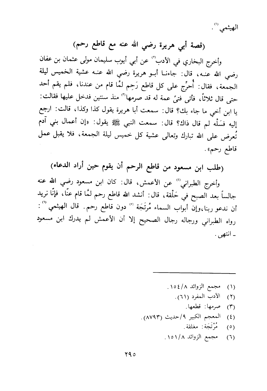 وأخرج الطبراني عن الأعمش قال: كان ابن مسعود رضي الله عنه جالساً بعد الصبح في حَلْقة قال: أنشد الله قطع رحم لمَّا قام عنّا، فإنّا نريد أن ندعو ربنا، وإن أبواب السماءُ مُرتَجَة دون قاطع رحم. قال الهيثمي: رواه الطبراني ورجاله رجال الصحيح إلا أن الأعمش لم يدرك ابن مسعود - انتهى.