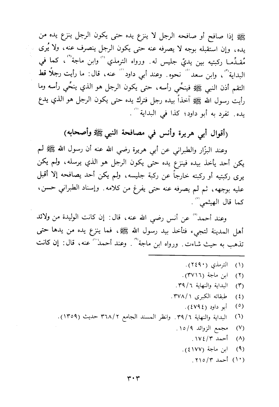 صلى الله عليه وسلم إذا صافح أو صافحه الرجل لا ينزع يده حتى يكون الرجل ينزع يده من يده، وإن استقبله بوجه لا يصرفه عنه حتى يكون الرجل ينصرف عنه، ولا يُعرى مُقدِّماً ركبتيه بين يدي جليس له. ورواه الترمذي وابن ماجه، كما في البداية، وابن سعد نحوه. وعند أبي داود عنه قال: ما رأيت رجلاً قط التقم أذن النبي صلى الله عليه وسلم فينحِّي رأسه، حتى يكون الرجل هو الذي ينحِّي رأسه وما رأيت رسول الله صلى الله عليه وسلم آخذاً بيده رجل فترك يده حتى يكون الرجل هو الذي يدع يده. تفرد به أبو داود؛ كذا في البداية.