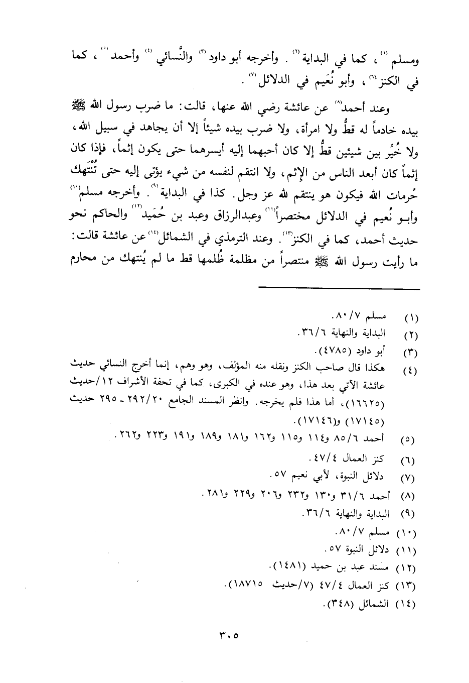 وعند أحمد عن عائشة رضي الله عنها قالت: ما ضرب رسول الله صلى الله عليه وسلم بيده خادماً له قطُّ ولا امرأة، ولا ضرب بيده شيئاً إلا أن يجاهد في سبيل الله، ولا خُيِّر بين شيئين قطُّ إلا كان أحبهما إليه إيسرهما حتى يكون إثماً، فإذا كان إثماً كان أبعد الناس من الإِثم، ولا أنتقم لنفسه من شيء يؤتى إليه حتى تنتهك حرمات الله فيكون هو ينتقم لله عز وجل. كذا في البداية. وأخرجه مسلم وأبو نُعَيم في الدلائل مختصراً وعبد الرزاق وعبد بن حُمَيد والحاكم نحو حديث أحمد كما في الكنز. وعند الترمذي في الشمائل (ص25) عن عائشة قالت: ما رأيت رسول الله صلى الله عليه وسلم منتصراً من مظلمة ظُلمها قط ما لم يُنتهك من محارم