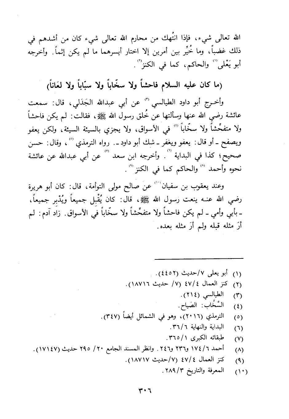 وأخرج أبو داود الطيالسي عن أبي عبد الله الجَدَلي قال: سمعت عائشة رضي الله عنها وسألتها عن خلق رسول الله صلى الله عليه وسلم فقالت: لم يكن فاحشاً ولا متفحِّشاً ولا سخّاباً في الأسواق، ولا يجزي بالسيئة السيئة، ولكن يعفو ويصفح - أو قال: يعفو ويغفر، شك أبو داود -. رواه الترمذي وقال: حسن صحيح؛ كذا في البداية. وأخرجه ابن سعد عن أبي عبد الله عن عائشة نحوه وأحمد والحاكم كما في الكنزل.