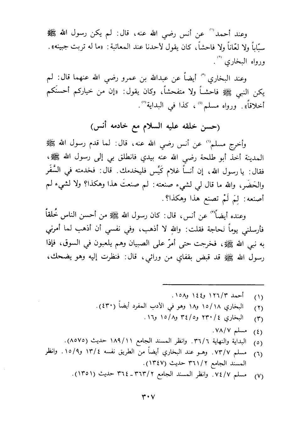 وأخرج مسلم عن أنس رضي الله عنه قال: لما قدم رسول الله صلى الله عليه وسلم المدينة أخذ أبو طلحة رضي الله عنه بيدي فانطلق بي إلى رسول الله صلى الله عليه وسلم فقال: يا رسول الله، إن أنساً غلام كَيِّس فيلخدمك. قال: فخدمته في السَّفَر والحَضَر، والله ما قال لي لشيء صنعته: لم صنعتَ هذا هكذا؟ ولا لشيء لم أصنعه: لم لم تصنع هذا هكذا؟. وعنده أيضاً عن أنس قال: كان رسول الله صلى الله عليه وسلم من أحسن الناس خلقاً فأرسلني يوماً لحاجة فقلت: والله لا أذهب، وفي نفسي أن أذهب لما أمرني به نبي الله صلى الله عليه وسلم فخرجت حتى أمرّ على الصبيان وهم يلعبون في السوق، فإذا رسول الله صلى الله عليه وسلم قد قبض بقفاي من ورائي، قال: فنظرت إليه وهو يضحك
