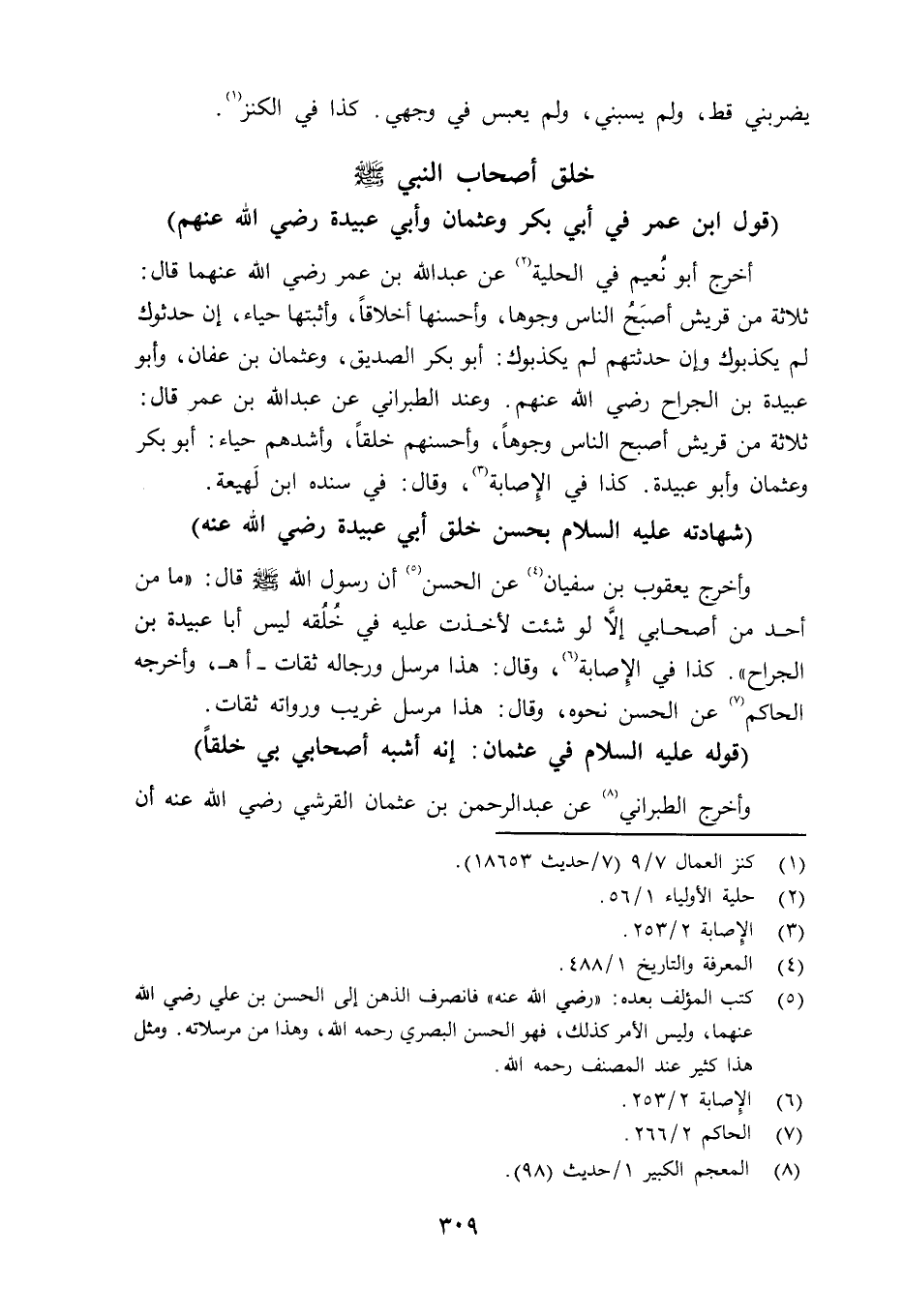 وأخرج يعقوب بن سفيان عن الحسن رضي الله عنه أن رسول الله صلى الله عليه وسلم قال: «ما من أحد من أصحابي إلاَّ لو شئت لأخذت عليه في خُلُقه ليس أبا عبيدة بن الجراح» . كذا في الإصابة، وقال: هذا مرسل ورجاله ثقات - اهـ، وأخرجه الحاكم عن الحسن نحوه، وقال: هذا مرسل غريب ورواته ثقات.
