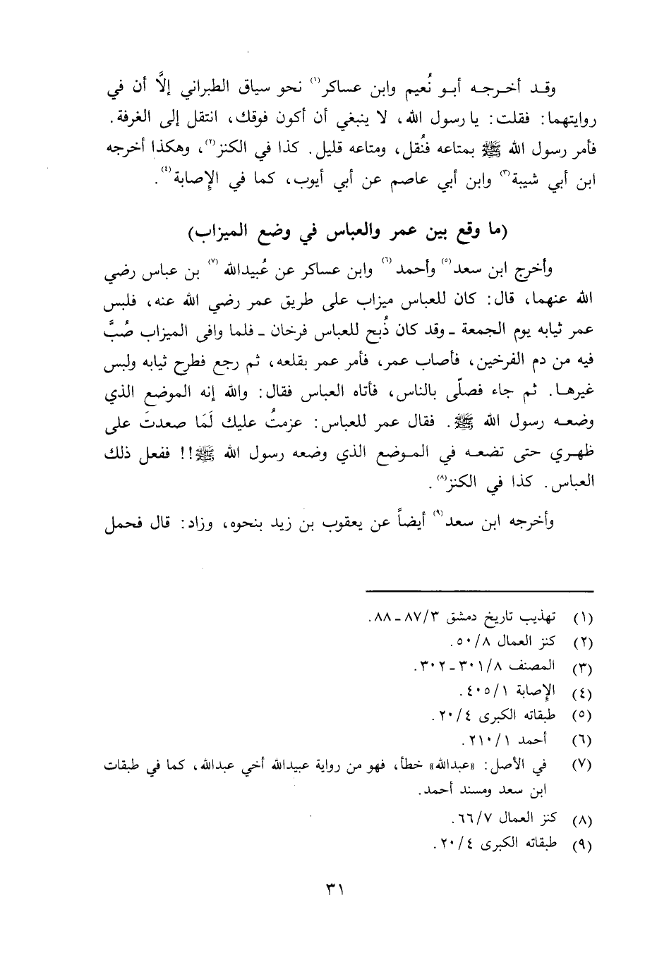 وأخرج ابن سعد وأحمد وابن عساكر عن عبد الله ابن عباس رضي الله عنهما قال: كان للعباس ميزاب على طريق عمر رضي الله عنه، فلبس عمر ثيابه يوم الجمعة - وقد كان ذُبح للعباس فرخان - فلما وافى الميزا صُبَّ فيه من دمُ الفرخين، فأصاب عمر، فأمر عمر بقلعه، ثم رجع فطرح ثيابه ولبس غيرها. ثم جاء فصلّى بالناس، فأتاه العباس فقال: والله إنه الموضع الذي وضعه رسول الله صلى الله عليه وسلم فقال عمر للعباس: عزمتُ عليك لما صعدَتَ على ظهري حتى تضعه في الموضع الذي وضعه رسول الله صلى الله عليه وسلم ففعل ذلك العباس. كذا في الكنز وأخرجه ابن سعد أيضاً عن يعقوب بن زيد بنحوه، وزاد) : قال فحمل