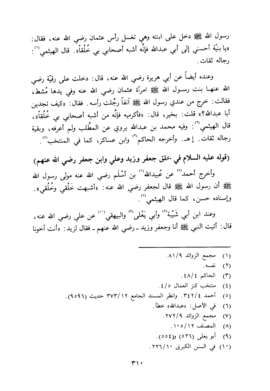 رسول الله صلى الله عليه وسلم دخل على ابنته وهي تغسل رأس عثمان رضي الله عنه، فقال: «يا بنيّة أحسني إلي أبي عبد الله فإنَّه أشبه أصحابي بي خُلُقاً» . قال الهيثمي: رجاله ثقات. وعنده أيضاً عن أبي هريرة رضي الله عنه قال: دخلت على رقيّة رضي الله عنها بنت رسول الله صلى الله عليه وسلم امرأة عثمان رضي الله عنه وفي يدها مُشط، فقالت: خرج من عندي رسول الله صلى الله عليه وسلم آنفاً رجَّلت رأسه. فقال: «كيف تجدين أبا عبد الله؟» قلت: بخير، قال: «فأكرميه فإنَّه من أشبه أصحابي بي خُلُقاً» ، قال الهيثمي: وفيه محمد بن عبد الله يروي عن المطَّلب ولم أعرفه، وبقية رجاله ثقات. اهـ. وأخرجه الحاكم وابن عساكر، كما في المنتخب.
