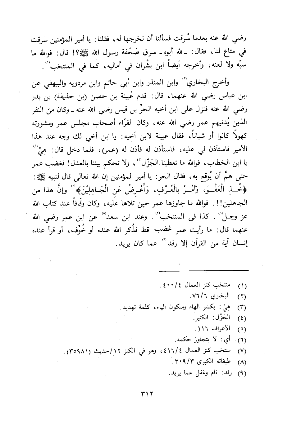 وأخرج البخاري وابن المنذر وابن أبي حاتم وابن مردويه والبيهقي عن ابن عباس رضي الله عنهما قال: قدم عيينة بن حصن (بن حذيفة) بن بدر رضي الله عنه فنزل على ابن أخيه الحرِّ بن قيس رضي الله عنه - وكان من النفر الذين يُدينهم عمر رضي الله عنه، وكان القرّاء أصحاب مجلس عمر ومشورته كهولاً كانوا أو شباناً -، فقال عيينة لابن أخيه: يا ابن أخي لك وجه عند هذا الأمير فاستأذن لي عليه، فاستأذن له فأذن له (عمر) ، فلما دخل عليه قال: هِي يا ابن الخطاب، فوالله ما تعطينا الجَزْل، ولا تحكم بيننا بالعدل فغضب عمر حتى همَّ أن يُوقع به، فقال الحر: يا أمير المؤمنين إن الله تعالى قال لنبيه صلى الله عليه وسلم {خُذِ الْعَفْوَ} {وَأْمُرْ بِالْعُرْفِ} {وَأَعْرِض عَنِ الْجَاهِلِينَ} (سورة الأعراف، الآية: 119) . وإنَّ هذا من الجاهلين. فوالله ما جاوزها عمر حين تلاها عليه، وكان وفاقاً عند كتاب الله عز وجل. كذا في المنتخب. وعند ابن سعد عن ابن عمر رضي الله عنهما قال: ما رأيت عمر غضب قط فذُكر الله عنده أو خُوِّف، أو قرأ عنده إنسان آية من القرآن إلا رقد عما كان يريد.