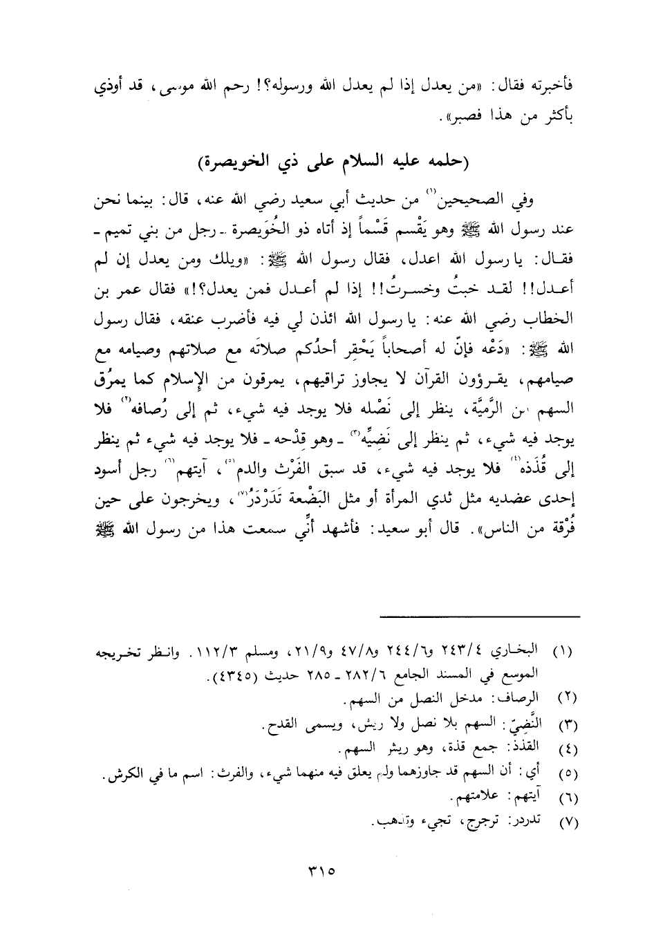 وفي الصحيحين من حديث أبي سعيد رضي الله عنه قال: بينما نحن عند رسول الله صلى الله عليه وسلم وهو يَقْسم قَسْماً إذ أتاه ذو الخُوَيصرة - رجل من بني تميم - فقال: يا رسول الله اعدل، فقال رسول الله صلى الله عليه وسلم «ويلك ومن يعدل إن لم أعدل لقد خبتُ وخسرتُ إذا لم أعدل فمن يعدل؟» فقال عمر ابن الخطاب رضي الله عنه: يا رسول الله ائذن لي فأضرب عنقه، فقال رسول الله صلى الله عليه وسلم «دَعْه فإنّ له أصحاباً يَحْقِر أحدُكم صلاتَه مع صلاتهم وصيامه مع صيامهم، يقرؤون القرآن لا يجاوز تراقَيهم، يمرقون من الإسلام كما يمرُق السهم من الرَّميَّة، ينظر إلى نَصْله فلا يوجد فيه شيء، ثم إلى رُصافة فلا يوجد فيه شيء، ثم ينظر إلى نَضِيَّة - وهو قِدْحه - فلا يوجد فيه شيء ثم ينظر إلى قُذَذه فلا يوجد فيه شيء، قد سبق الفَرْث والدم، آيتهم رجل أسود إحدى عضديه مثل ثدي المرأة أو مثل البضعة تَدَرْدَرُ، ويخرجون على حين فُرْقة من الناس» ، قال أبو سعيد: فأشهد أنِّي سمعت هذا من رسول الله صلى الله عليه وسلم