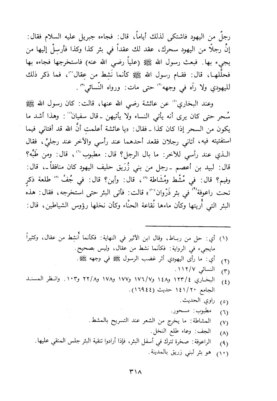 رجلٌ من اليهود لذلك أياماً، قال: فجاءه جبريل عليه السلام فقال: إنَّ رجلاً من اليهود سحرك، عقد لك عقداً في بئر كذا وكذا فأرسْلْ إليها من يجيىء بها. فبعث رسول الله صلى الله عليه وسلم (علياً رضي الله تعالى عنه) فاستخرجها فجاءه بها فحلَّلها، قال: فقام رسول الله صلى الله عليه وسلم كأنما نَشِط من عَقال، فما ذكر ذلك لليهود ولا رآه في وجهه حتى مات ورواه النسائي.