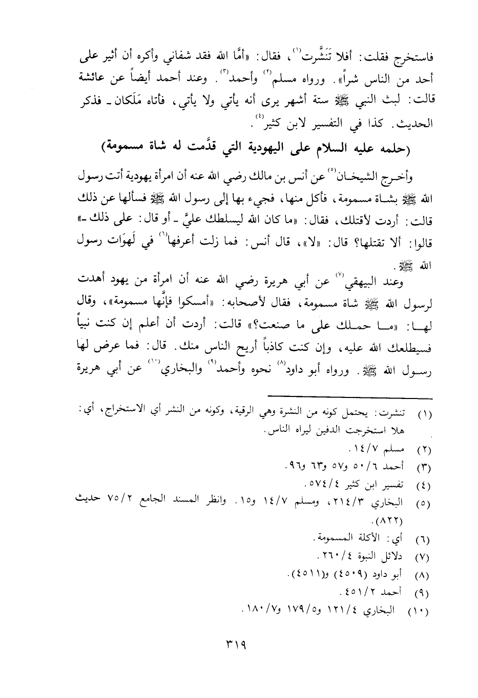 Y وعند البيهقي عن أبي هريرة رضي الله عنه أن امرأة من يهود أهدت لرسول الله صلى الله عليه وسلم شاة مسمومة، فقال لأصحابه: «أمسكوا فإنَّها مسمومة» وقال لها: «ما حملك على ما صنعت؟» قالت: أردت أن أعلم إن كنت نبياً فسيطلعك الله عليه، وإن كنت كاذباً أريح الناس منك، قال: فما عرض لها رسول الله صلى الله عليه وسلم ورواه أبو داود نحوه وأحمد والبخاري عن أبي هريرة