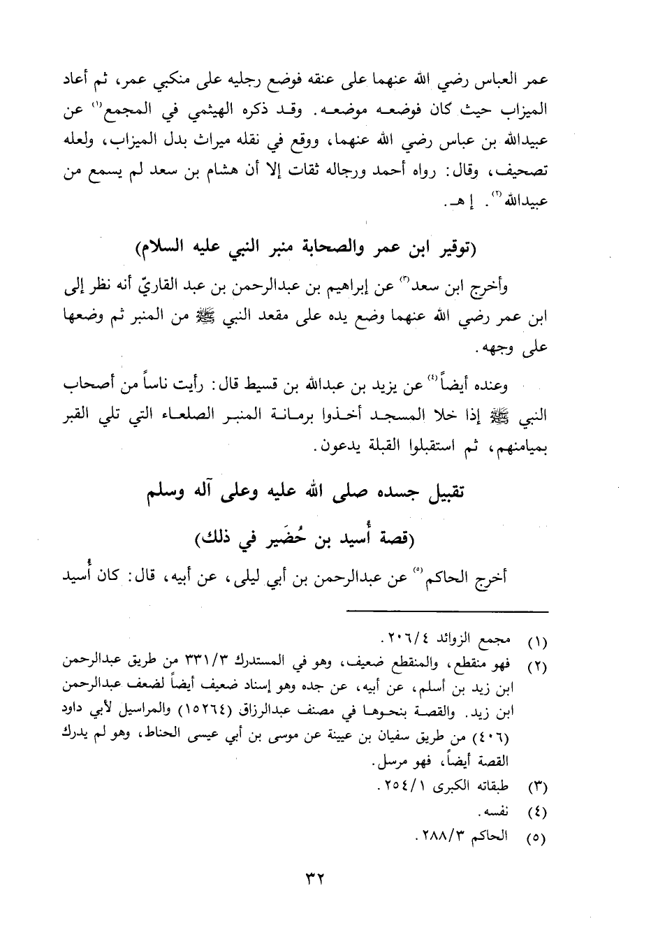 وأخرج ابن سعد عن إبراهيم بن عبد الرحمن بن عبد القاري أنه نظر إلى ابن عمر رضي الله عنهما وضع يده على مقعد النبي صلى الله عليه وسلم نم المنبر ثم وضعها على وجهه. وعنده أيضاً عن يزيد بن عبد الله بن قسيط قال: رأيت ناساً من أصحاب النبي صلى الله عليه وسلم إذا خلا المسجد أخذوا برمانة المنبر الصلعاء التي تلي القبر بميامنهم، ثم استقبلوا القبلة يدعوه.