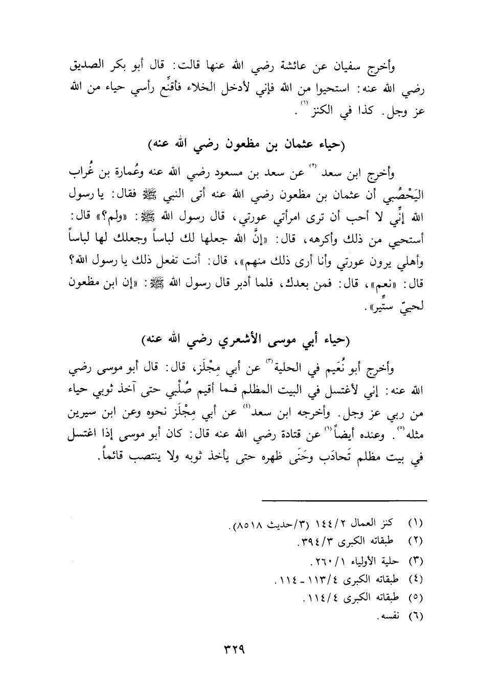 وأخرج أبو نُعَيم في الحلية عن أبي مِجْلَز قال قال أبو موسى رضي الله عنه: إني لأغتسل في البيت المظلم فما أقيم صلبي حتى أخذ ثوبي حياء نم ربي عز وجل. وأخرجه ابن سعد عن أبي مِجْلَز نحوه وعن ابن سيرين مثله، وعنده أيضاً عن قتادة رضي الله عنه قال: كان أبو موسى إذا اغتسل في بيت مظلم تجاذب وحنى ظهره حت يأخذ ثوبه ولا ينتصب قائماً.