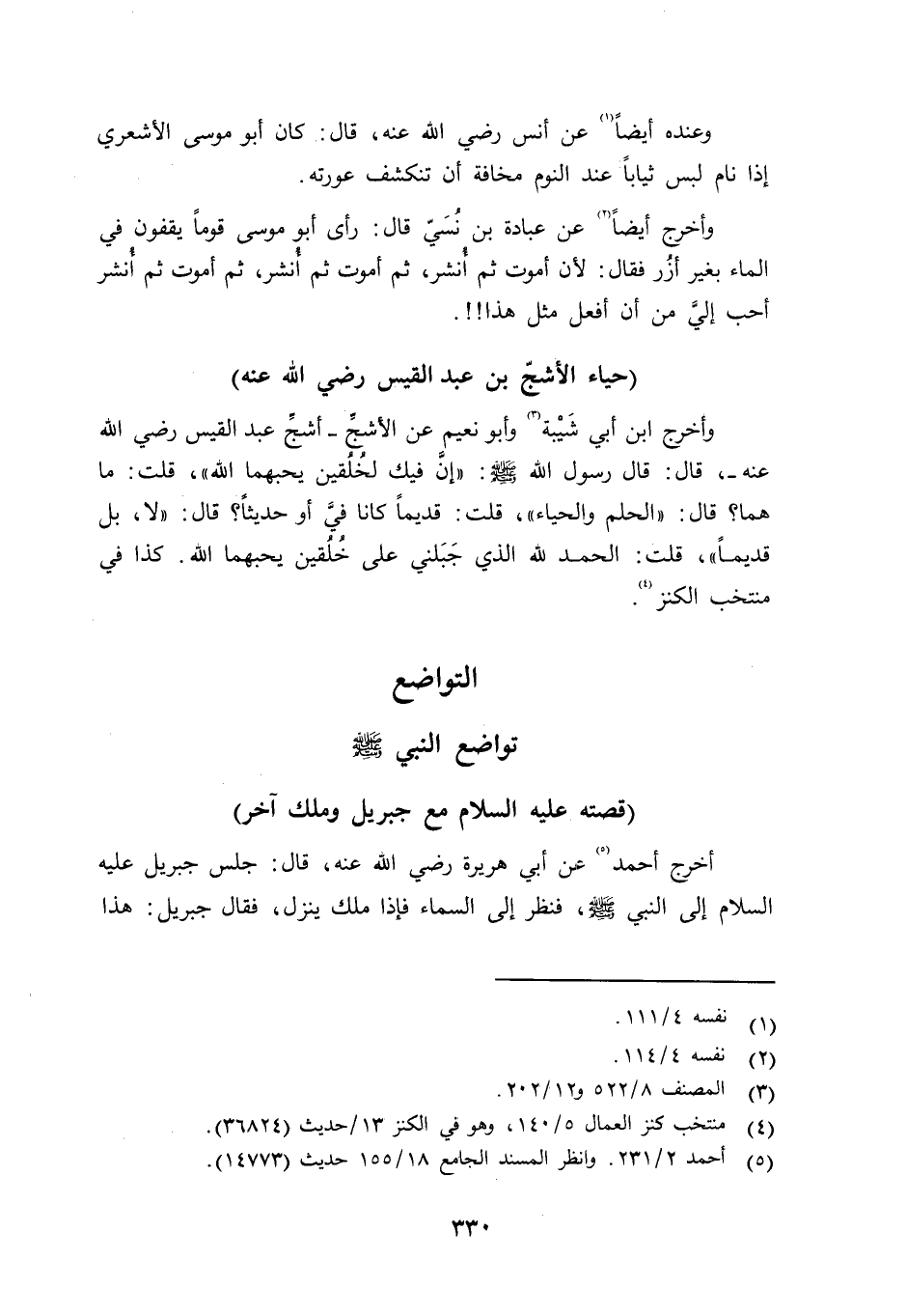 وعنده أيضاً عن أنس رضي الله عنه قال: كان أبو موسى الأشعري إذا نام لبس ثياباً عند النوم مخافة أن تنكشف عورته. وأخرج أيضاً عن عبادة بن نُسَيّ قال: رأى أبو موسى قوماً يقفون في الماء بغير أُزر فقال: لأن أموت ثم أنشر، ثم أموت ثم أنشر، ثم أموت ثم أنشر أحب إليَّ من أن أفعل مثل هذا
