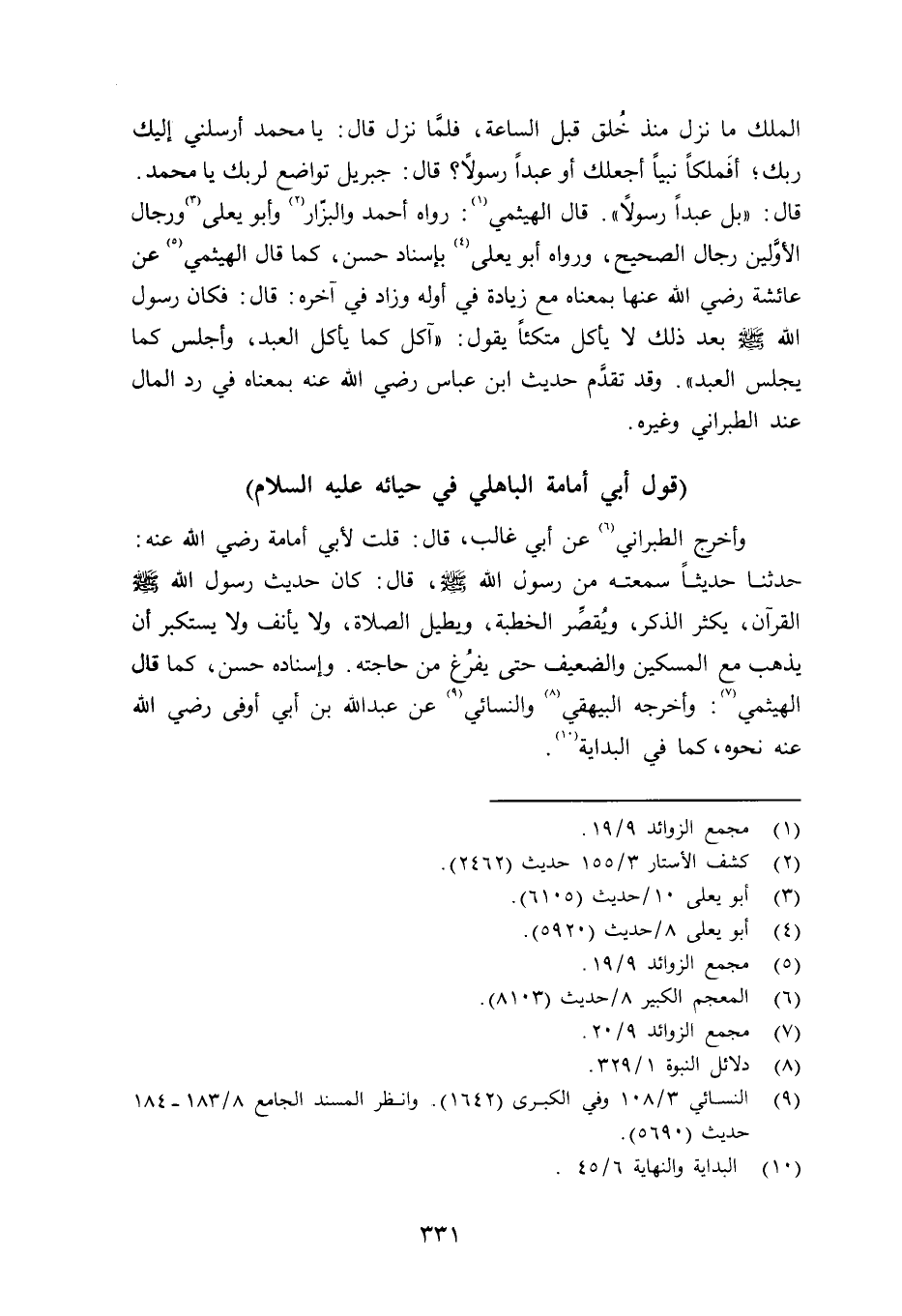 الملك ما نزل منذ خُلق قبل الساعة، فلَّما نزل قال: يا محمد أرسلني إليك ربك؛ أفَملكاً نبياً أجعلك أو عبداً رسولاً؟ قال جبريل: تواضع لربك يا محمد. قال: «بل عبداً رسولاً» . قال الهيثمي: رواه أحمد والبزّار وأبو يعلى ورجال الأوَّلين رجال الصحيح، ورواه أبو يعلى بإسناده حسن، كما قال الهيثمي عن عائشة رضي الله عنه بمعناه مع زيادة في أوله وزاد في آخره: قال: فكان رسول الله صلى الله عليه وسلم بعد ذلك لا يأكل متكئاً يقول: «آكل ما يأكل العبد، وأجلس كما يجلس العبد» . وقد تقدَّم حديث ابن عباس رضي الله عنه بمعناه في رد المال عند الطبراني وغيره.