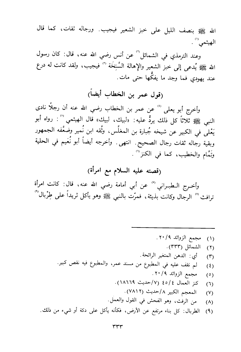 وأخرج أبو يعلى عن عمر بن الخطاب رضي الله عنه أن رجلاً نادى النبي صلى الله عليه وسلم ثلاثاً كل ذلك يردُّ عليه: «لبيك، لبيك» قال الهيثمي: رواه أبو يَعْلى في الكبير عن شيخه جُبارة بن المغلِّس، وثَّقه ابن نُمير وضعَّفه الجمهور وبقية رجاله ثقت رجال الصحيح. انتهى. وأخرجه أيضاً أبو نُعَيم في الحلية وتمَّام والخطيب، كما في الكنز.