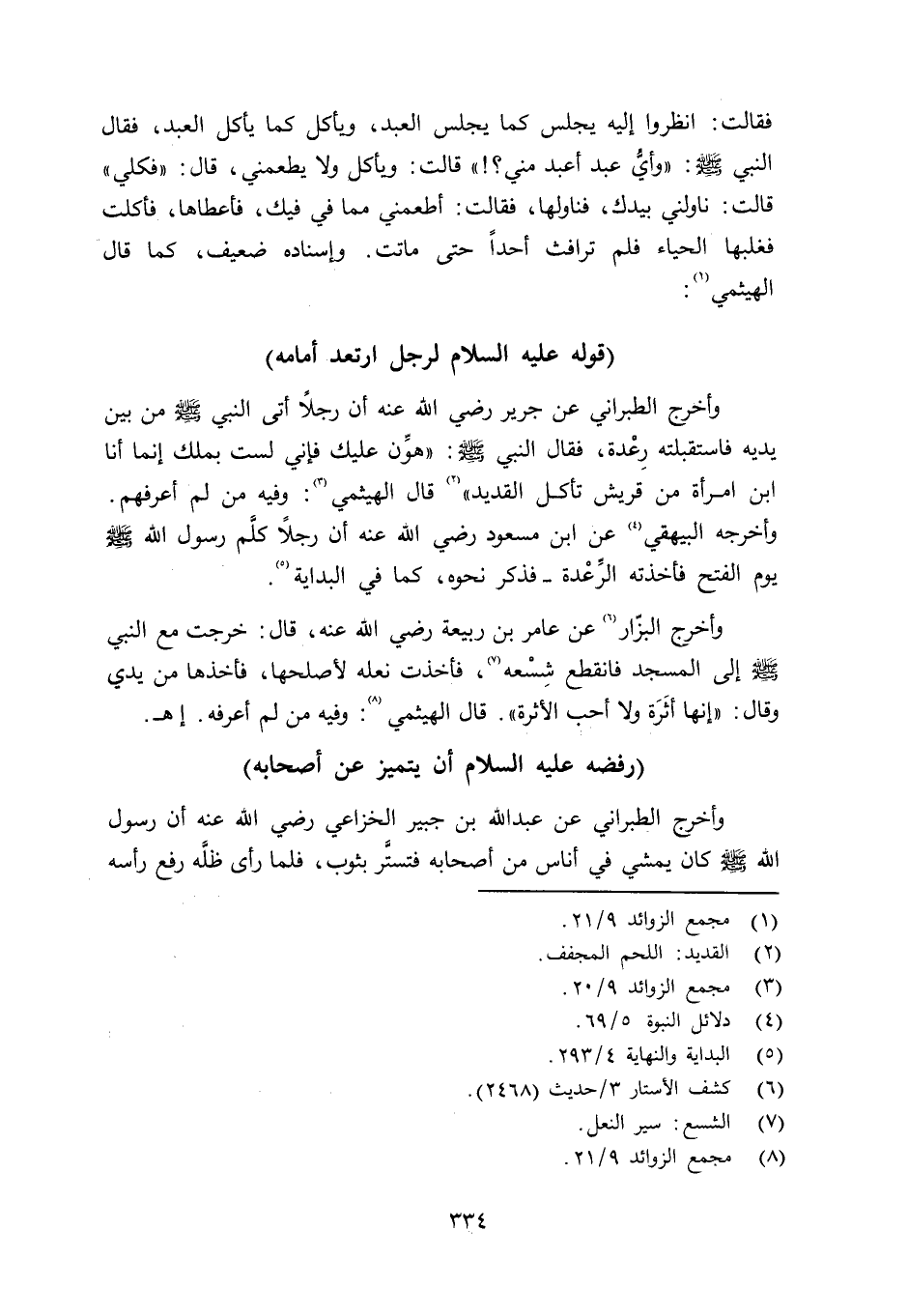وأخرج الطبراني عن جرير رضي الله عنه أن رجلاً أتى النبي صلى الله عليه وسلم من بين يديه فاستقبلته رِعْدة، فقال النبي صلى الله عليه وسلم «هوِّن عليك فإني لست بملك إنما أنا ابن امرأة من قريش تأكل القديد» قال الهيثمي: وفيه من لم أعرفهم. وأخرجه البيهقي عن ابن مسعود رضي الله عنه أن رجلاً كلَّم رسول الله صلى الله عليه وسلم يوم الفتح فأخذته الرِعْدة - فذكر نحوه، كما في ابداية. وأخرج البزّار عن عامر بن ربيعة رضي الله عنه قال: خرجت مع النبي صلى الله عليه وسلم إلى المسجدة فانقطع شِسْعه، فأخذت نعله لأصلحها، فأخذها من يدي وقال: «إنها أَثَرة ولا أحب الأثرة» . قال الهيثمي: وفيه من لم أعرفه اهـ.