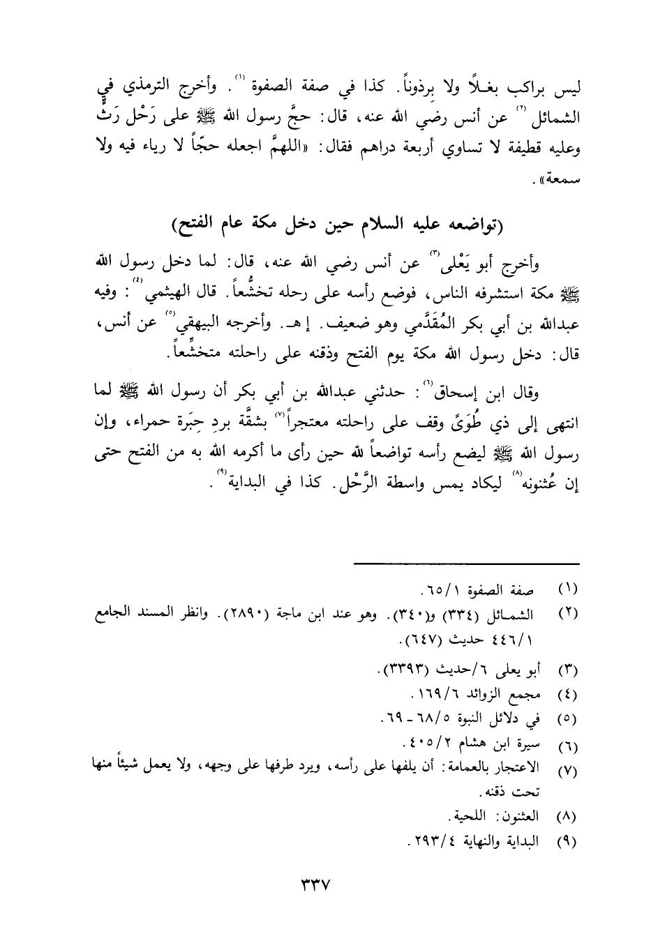 وأخرج أبو يَعْلى عن أنس رضي الله عنه قال: لما دخل رسول الله صلى الله عليه وسلم مكة استشرفه الناس، فوضع رأسه على رحله تخشُّعاً. قال الهيثمي: وفيه عبد الله بن أبي بكر المقدَّمي وهو ضعيف. اهـ. وأخرجه البيهقي عن أنس قال: دخل رسول الله مكة يوم الفتح وذقته على راحلته متخشِّعاً. وقال ابن إسحاق: حدثني عبد الله بن أبي بكر أن رسول الله صلى الله عليه وسلم ليضع رأسه تواضعاً لله حين رأى ما أكرمه الله به من افتح حتى إن عُثنونه ليكاد يمس واسطة الرَّحْل. كذا في البداية.