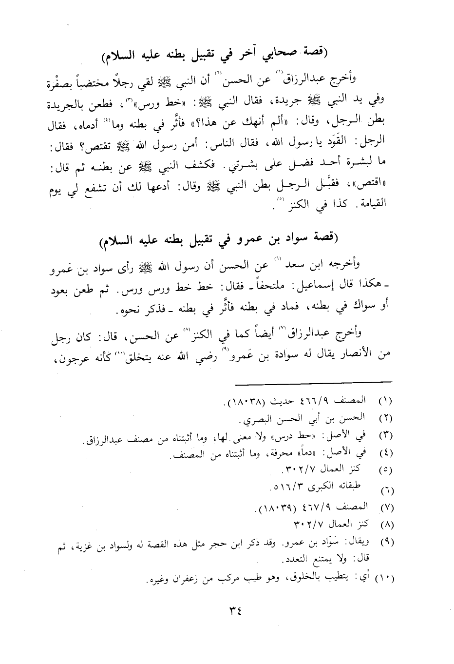وأخرج عبد الرزاق عن الحسن أن النبي صلى الله عليه وسلم لقي رجلاً مختصباً بصفْرة وفي يد النبي صلى الله عليه وسلم جريدة، فقال النبي صلى الله عليه وسلم «حط درس» ، فطعن بالجريدة بطن الرجل وقال: «ألم أنهك عن هذا؟» فأثَّر في بطنه دماً أدماه، فقال الرجل: القول يا رسول الله، فقال الناس: أمن رسول الله صلى الله عليه وسلم تقتص؟ فقال: ما لبشرة أحد فضل على بشرتي. فكشف النبي صلى الله عليه وسلم عن بطنه ثم قال: «اقتص» ، فقبَّل الرجل بطن النبي صلى الله عليه وسلم وقال: أدعها لك أن تشفع لي يوم القيامة. كذا في الكنزل.