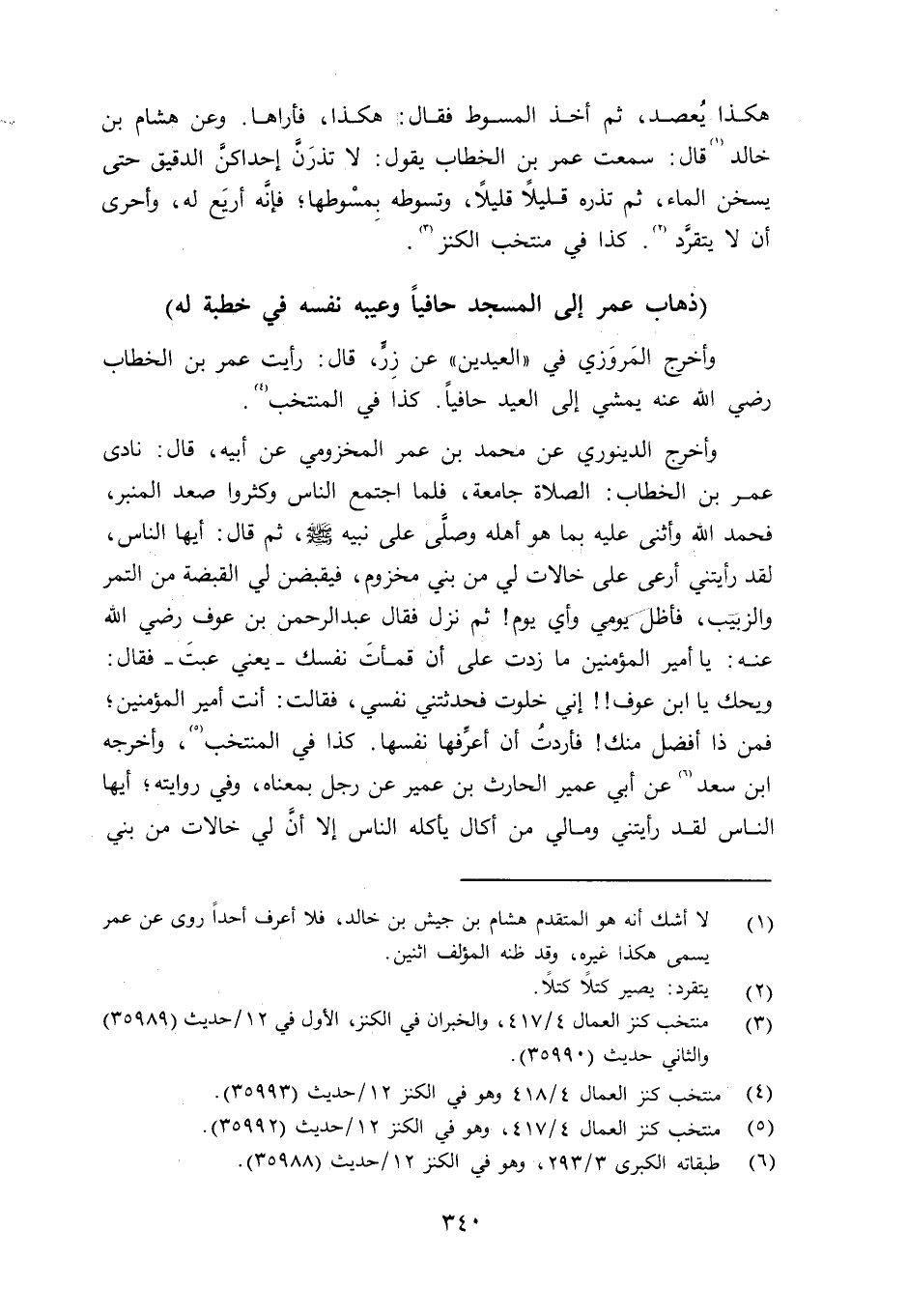 وأخرج المَروَزي في العِيدين عن زِرَ قال: رأيت عمر بن الخطاب رضي الله عنه يمشي إلى العيد حافياً. كذا في المنتخب؛ وأخرج الدينوري عن محمد بن عمر المخزومي عن أبيه قال: نادى عمر بن الخطاب: الصلاة جامعة، فلما اجتمع الناس وكثروا صعد المنبر، فحمد الله وأثنى عليه بما هو أهله وصلَّى على نبيه صلى الله عليه وسلم ثم قال: أيها الناس، لقد رأيتني أرعى على خالات لي من بني مخزوم، فيقبضن لي القبضة من التمر والزبيب، فأظل يومي وأي يوم ثم نزل فقال عبد الرحمن بن عوف رضي الله عنه: يا أمير المؤمنين ما زدت على أن قمأتَ نفسك - يعني عبتَ - فقال: ويحك يا ابن عوف إني خلوت فحدثتني نفسي، فقالت: أنت أمير المؤمنين؛ فمن ذا أفضل منك فأردت أن أعرِّفها نفسها. كذا في المنتخب، وأخرجه ابن سعد عن أبي عمير الحارث بن عمير عن رجل بمعناه، وفي روايته: أيها الناس لقد رأيتني ومالي من أكال يأكله الناس إلا أنَّ لي خالات من بني