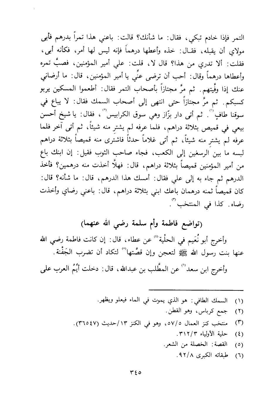وأخرج أبو نُعَيم في الحِلْية عن عطاء قال: إن كانت فاطمة رضي الله عنها بنت رسول الله صلى الله عليه وسلم لتعجن وإن قصَّتها لتكاد أن تضرب الجَفْنة. وأخرج ابن سعد عن المطَّلب بن عبد الله قال: دخلت أيِّمُ العرب على