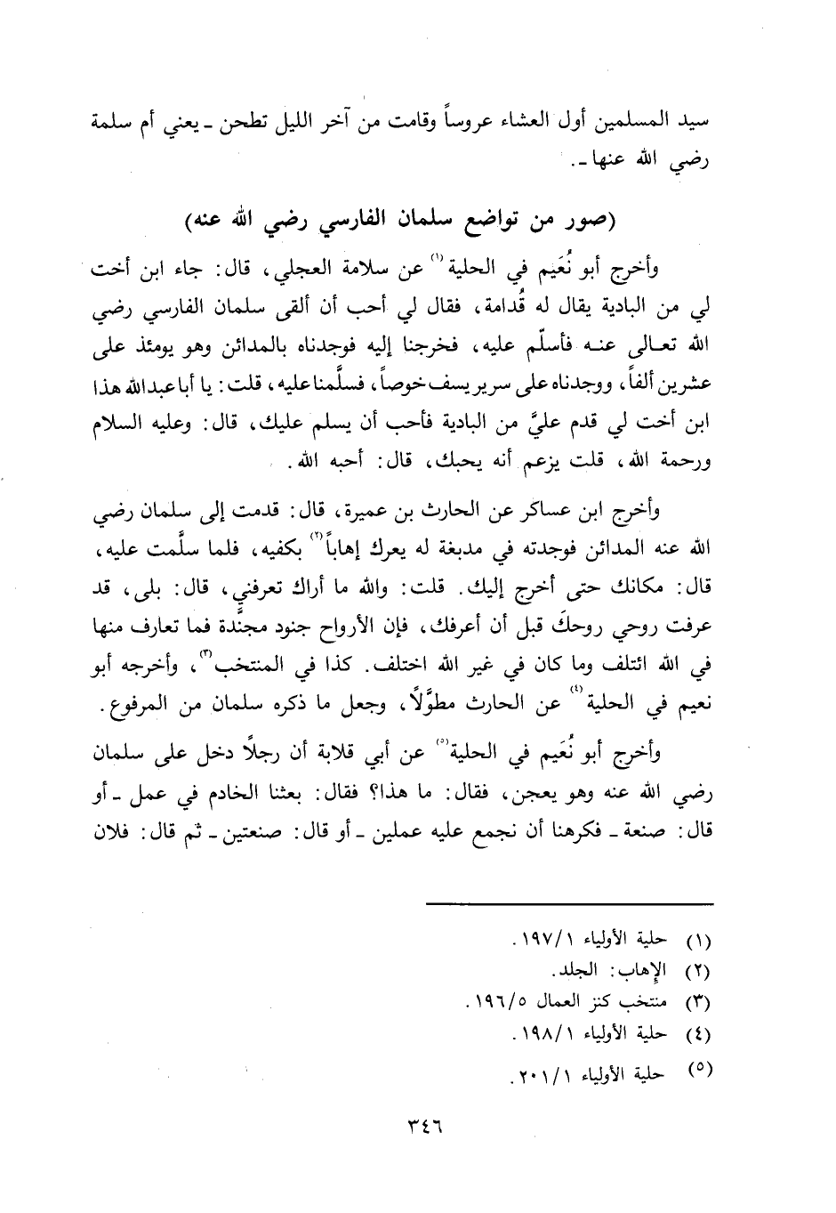 وأخرج أبو نُعَيم في الحلية عن أبي قلابة أن رجلاً دخل على سلمان رضي الله عنه وهو يعجن فقال: ما هذا؟ فقال: بعثنا الخادم في عمل - أو قال: صنعة - فكرهنا أن نجمع عليه عملين - أو قال: صنعتين - ثم قال: فلان