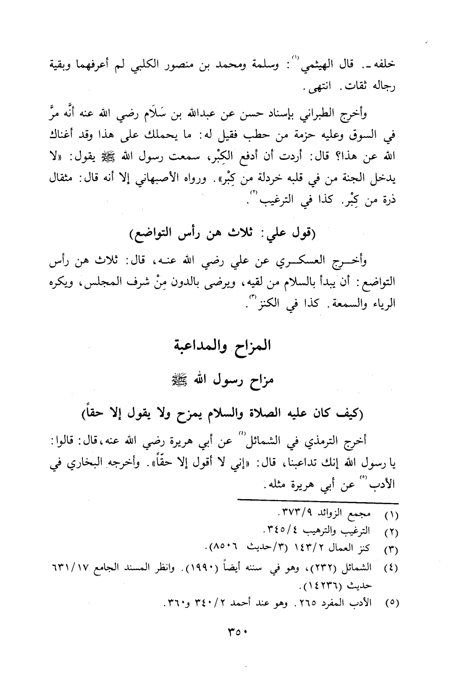 خلفه -. قال الهيثمي: وسلم ة ومحمد بن منصور الكلبي لم أعرفهما وبقية رجاله ثقات. انتهى. وأخرج الطبراني بإسناد حسن عن عبد الله بن سلام رضي الله عنه أنَّه مرَّ في السوق وعليه حزمة من حطب فقيل له: ما يحملك على هذا وقد أغناك الله عن هذا؟ قال: أردت أن أدفع الكِبْر، سمعت رسول الله صلى الله عليه وسلم يقول: «لا يدخل الجنة من في قلبه خردلة من كِبْر» . ورواه الأصبهاني إلا أنه قال: مثقال ذرة من كِبْر. كذا في الترغيب.