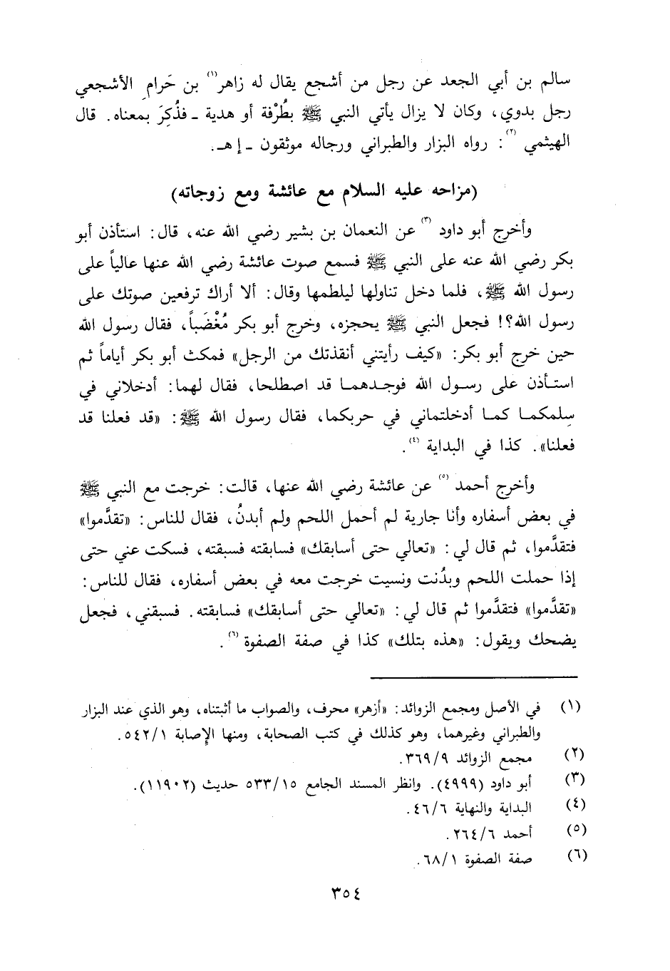 وأخرج أحمد عن عائشة رضي الله عنها قالت: خرجت مع النبي صلى الله عليه وسلم في بعض أسفاره وأنا جارية لم أحمل اللحم ولم أبدنُ، فقال للناس: «تقدَّموا» فتقدَّموا، ثم قال لي: «تعالي حتى أسابقك» فسابقته فسبقته، فسكت عني حتى إذا حملت اللحم وبدُنت ونسيت خرجت معه في بعض أسفاره، فقال للناس: «تقدَّموا ثم قال لي: «تعالي حتى أسابقك» فسابقته. فسبقني، فجعل يضحك ويقول: «هذه بتلك» كذا في صفة الصفوة.