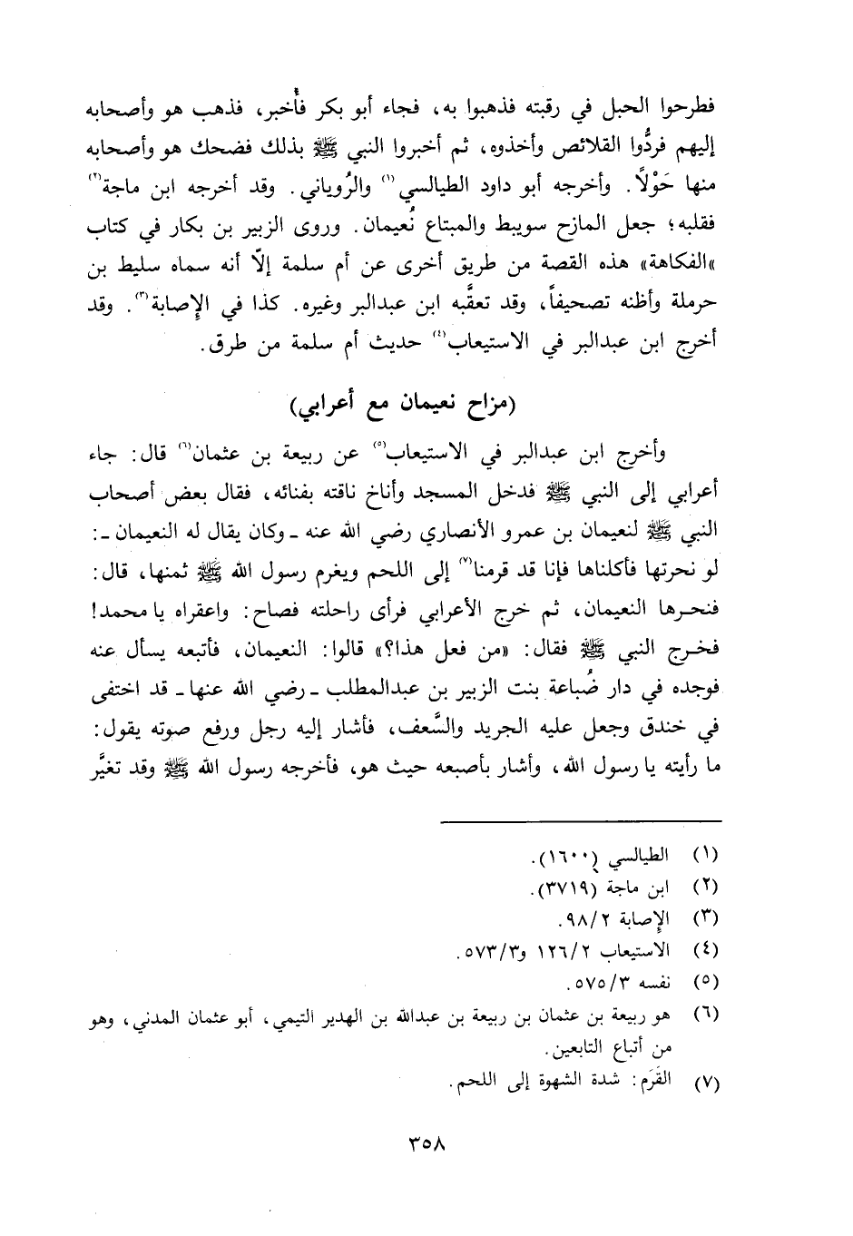 وأخرج ابن عبد البرفي الاستيعاب عن ربيعة بن عثمان رضي الله عنه قال: جاء أعرابي إلى النبي صلى الله عليه وسلم فدخل المسجد وأناخ ناقته بفنائه، فقال بعض أصحاب النبي صلى الله عليه وسلم لنعيمان بن عمرو الأنصار رضي الله عنه - وكان يقال له النعيمان -: لو نحرتها فأكلناها فإنا قد قرمنا إلى اللحم ويغرم رسول الله صلى الله عليه وسلم ثمنها، قال: فنحرها النعيمان، ثم خرج الأعرابي فرأى راحلته فصاح: واعقراه يا محمد فخرج النبي صلى الله عليه وسلم فقال: «من فعل هذا؟» قالوا: النعيمان، فأتبعه يسأل عنه فوجده في دار ضُباعة بنت الزبير بن عبد المطلب - رضي الله عنها - قد اختفى في خندق وجعل عليه الجريد والسَّعف، فأشار إليه رجل ورفع صوته يقول: ما رأيته يا رسول الله، وأشار بإصبعه حيث هو، فأخرجه رسول الله صلى الله عليه وسلم وقد تغيَّر