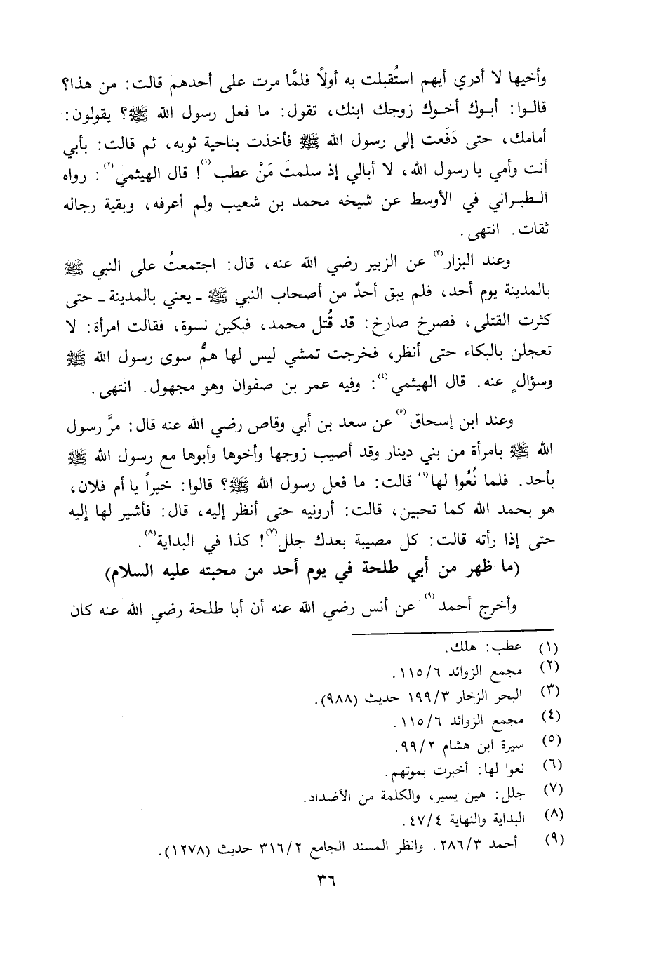 وأخيها لا أدري أيهم استُقبلت به أولاً، فلَّما مرت على أحدهم قالت: من هذا؟ قالوا: أبوك أخوك زوجك ابنك، تقول: ما فعل رسول الله صلى الله عليه وسلم يقولون: أمامك، حتى دَفَعت إلى رسول الله صلى الله عليه وسلم فأخذت بناحية ثوبه، ثم قالت: بأبي أنت وأمي يا رسول الله، لا أبالي إذا سلمتَ مَنْ عطب قال الهيثيم: رواه الطبراني في الأوسط عن شيخه محمد بن شعيب ولم أعرفه، وبقية رجاله ثقات. انتهى.