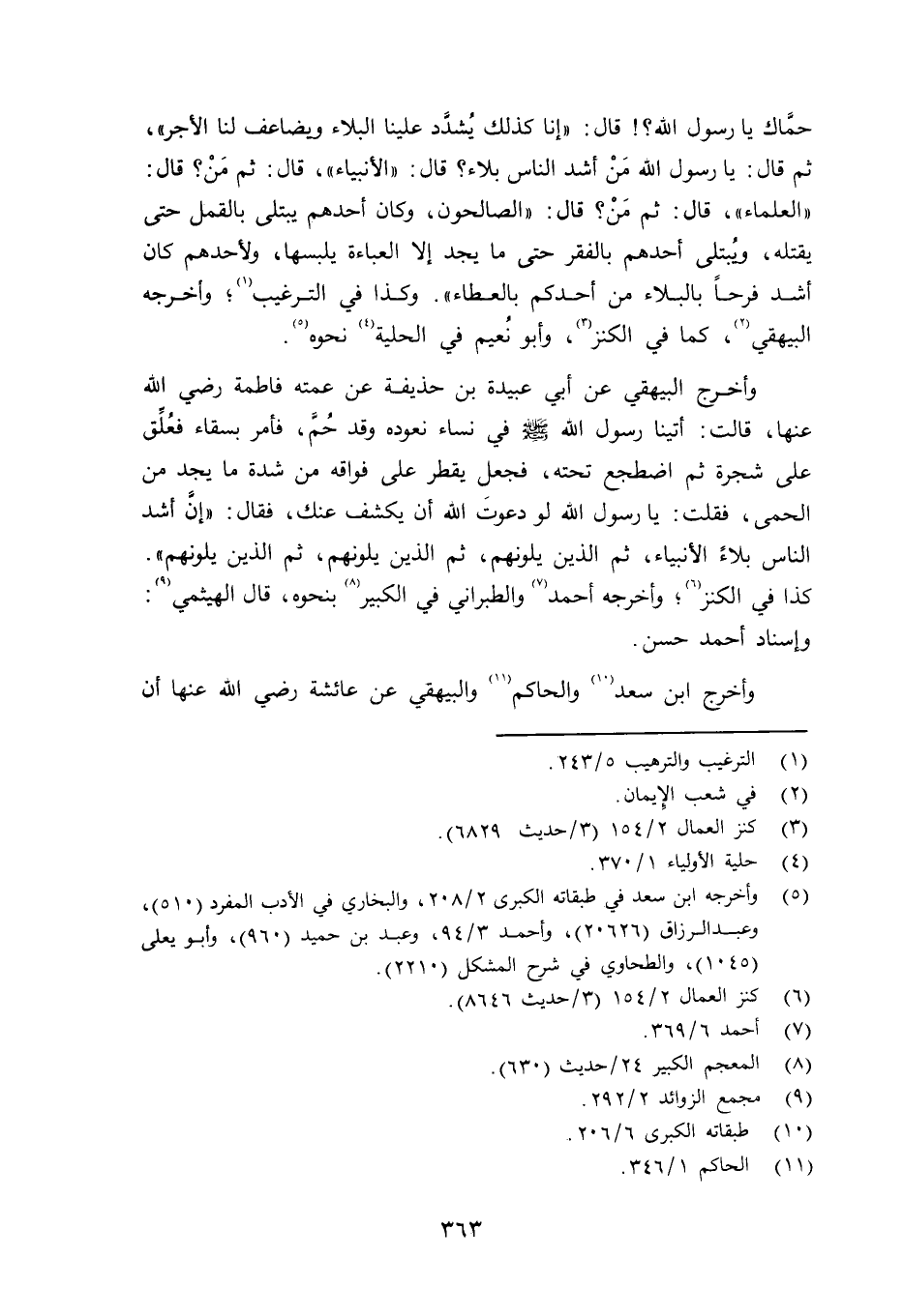 حمَّاك يا رسول الله؟ قال: «إنا كذلك يُشددَّ علينا البلاء ويضاعف لنا الأجر» ، ثم قال: يا رسول الله مَنْ؟ أشد الناس بلاء؟ قال: «الأنبياء» ، قال: ثم مَنْ؟ قال: «العلماء» ، قال: ثم مَنْ؟ قال: «الصالحون» ، وكان أحدهم يُبتلى بالقمل حتى يقتله، ويُبتلى أحدهم بالفقر تحى ما يجد إلا العباءة يلبسها، ولأحدهم كان أشد فرحاً بالبلاء من أحدكم بالعطاء» . وكذا في الترغيب؛ وأخرجه البيهقي، كما في الكنزل وأبو نُعيم في الحلية نحوه.
